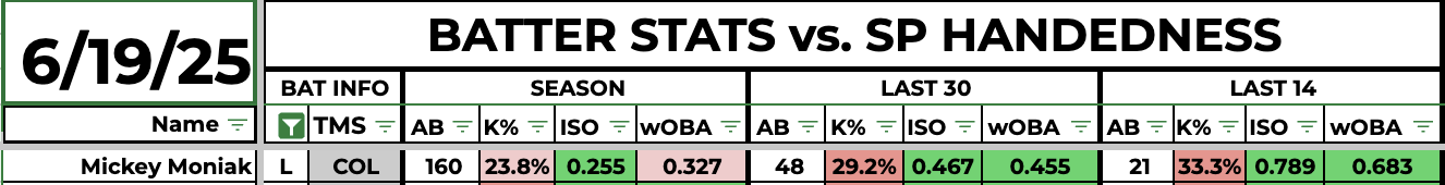 Moniak is swinging a hot bat this season against right-hand pitching. He has a .327 wOBA, .255 ISO, 42.3% FB, and a 42.0% Hard Hit against the split this season. Over his last 21 plate appearances, Moniak has a .683 wOBA and a .789 ISO.