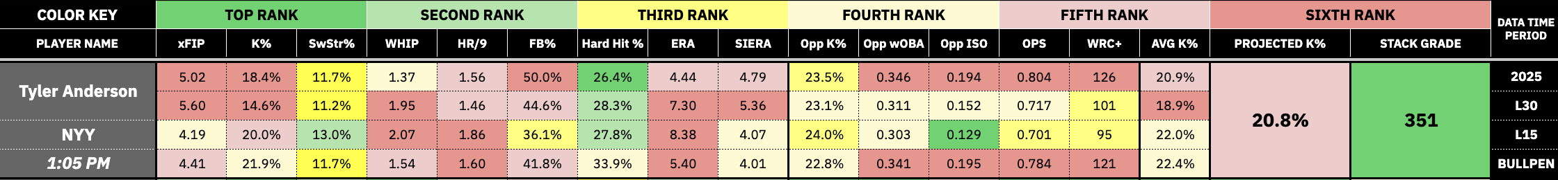 The southpaw Anderson has a 5.02 xFIP, 1.37 WHIP, 1.56 HR/9, and a 50.0% FB this season. He has a 5.60 xFIP, 1.95 WHIP, 1.46 HR/9, and a 44.6% FB this season. Anderson is not your traditional lefty, as he has severe reverse splits. He has a .415 wOBA, .287 ISO, 2.7 HR/9, and a 53.6% FB this season against left-hand hitters.