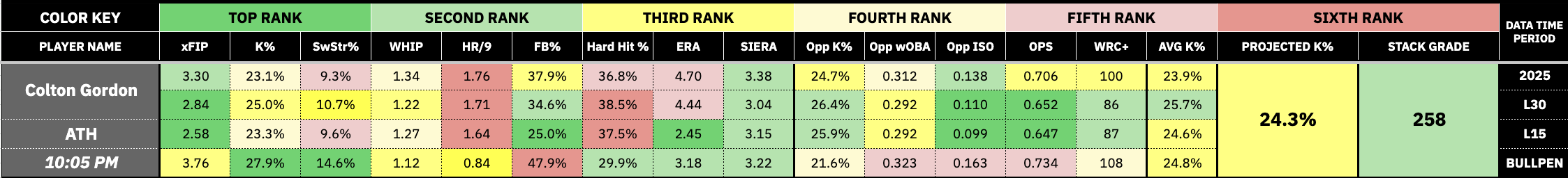 Gordon has been a decent arm since his call-up this season. He has a 3.30 xFIP, 9.3% SwStr, 1.34 WHIP, 1.76 HR/9, 37.9% FB, and a 36.8% Hard Hit. Over his last 30 games, he has a 1.72 HR/9 and a 38.5% Hard Hit rate. Righties have a .380 wOBA, .250 ISO, 2.1 HR/9, and a 41.0% FB against this season.