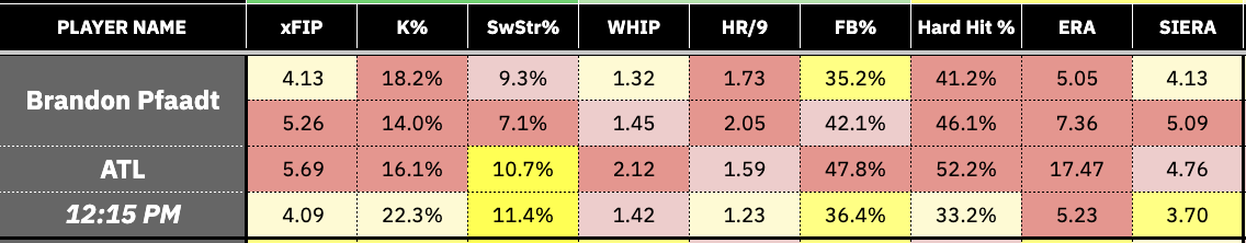 The trend I am seeing here is the amount of hard contact Brandon Pfaadt is allowing. He has a 41.2% Hard Hit this season and a 52.2% Hard Hit over his last two starts. This comes with a 1.59 HR/9 and a 47.8% FB during the same period.