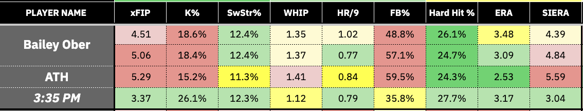 Ober is my target in this game. He has a 57.1% FB over his last four starts. He also has a 5.06 xFIP with a 3.09 ERA during that span. There is some negative regression coming for Ober, and what better spot than this?