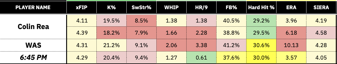 James Wood has appeared in this article for RotoBaller countless times. He has a .415 wOBA and a .288 ISO against right-hand pitching this season. Over his last 40 PA, he has been even better. He has a .447 wOBA, .394 ISO, and a .697 SLG against right-hand pitching. Wood has 16 home runs this season. Let’s check out how he handles Rea.