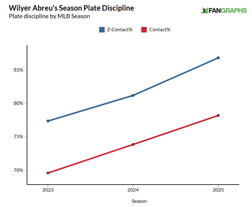 Abreu has been improving as an overall hitter as well. After having a strikeout rate above 27% in both 2023 and 2024, he trimmed that to 24.2% in 2025. But even more importantly, Abreu increased his zone contact rate from 76.9% to 83.7% and his overall contact rate from 70.6% to 76%. Boston has also said that Abreu won't be platooned as much as he was in 2025.