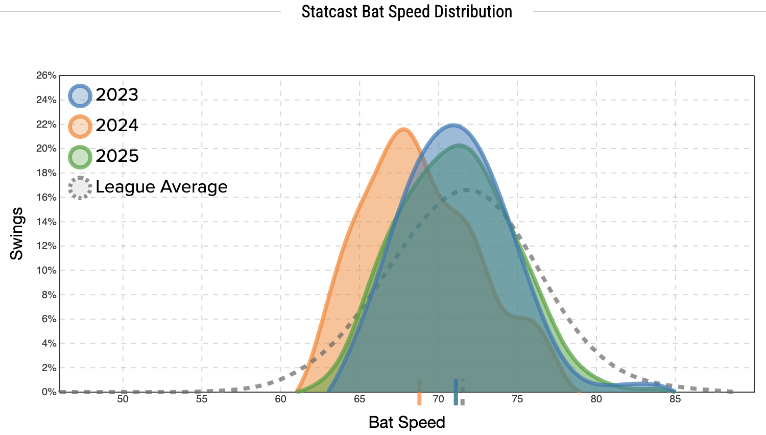 After lengthy absences in 2023 and 2024, Story was a monster with 25 home runs and 31 stolen bases in 2025. Story had the largest increase in EV50 (6 mph) in 2025, with a 3.8 mph jump in his average EV on FB/LD. He had mediocre bat speed (71.1 mph) and a fast swing rate (14.2 percent) in 2025.