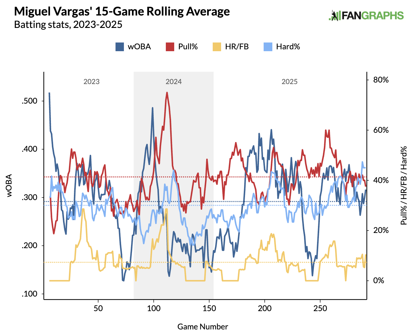 Vargas might be the most surprising name here since he hasn't been known for power. He increased his EV50 by 3.5 mph with a 3 mph improvement in his average EV on FB/LD in 2025. Vargas leaned into the pulled air (23.1 percent) theme in 2025, after 23 percent in 2024. He boasted a 17.5 percent barrel rate, translating to a .713 wOBA (.548 xwOBA) on pulled FB/LD in 2025.