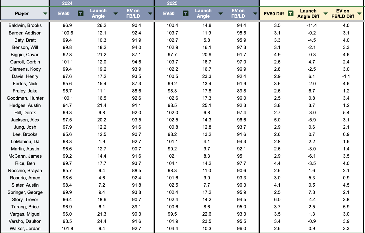 EV50 correlates well with barrels (0.524) and barrels per plate appearance (0.641). That's unsurprising since barrels involve batted balls with an exit velocity of 98 mph at an optimal launch angle (26-30 degrees). The hitters in this article improved their EV50 by 3 mph or more in 2025 compared to 2024.