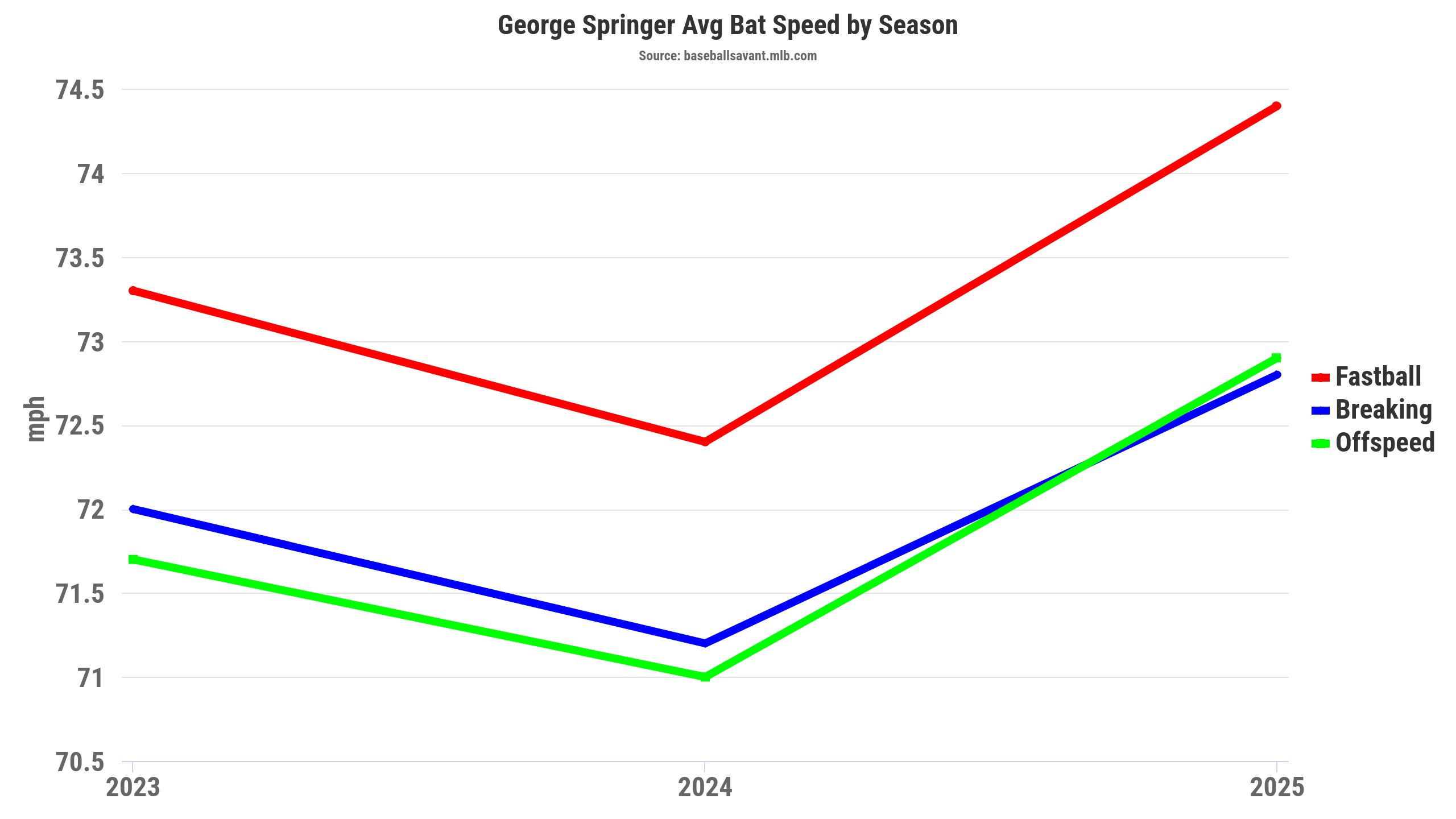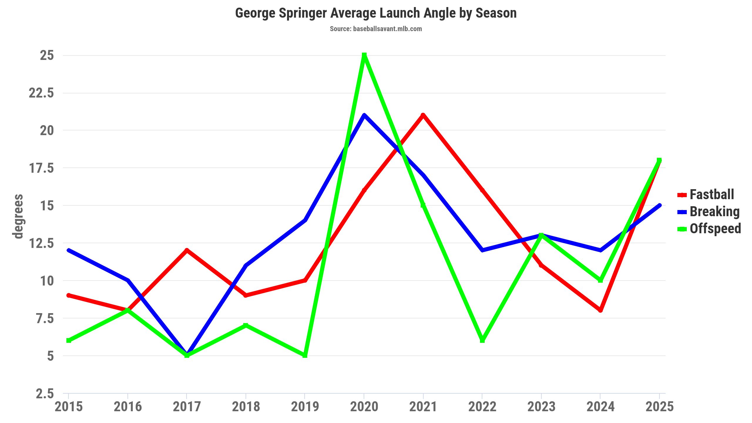 He also significantly improved his launch angle, which had been trending down over the past few seasons. That's evident in Springer's launch angles of 13.9 degrees in 2022, 12 degrees in 2023, 9.4 degrees in 2024, and 17.2 degrees in 2025. Springer made a concerted effort to pull the ball in the air (18.7 percent) in 2025 after being around 15-16 percent (2023-2024).