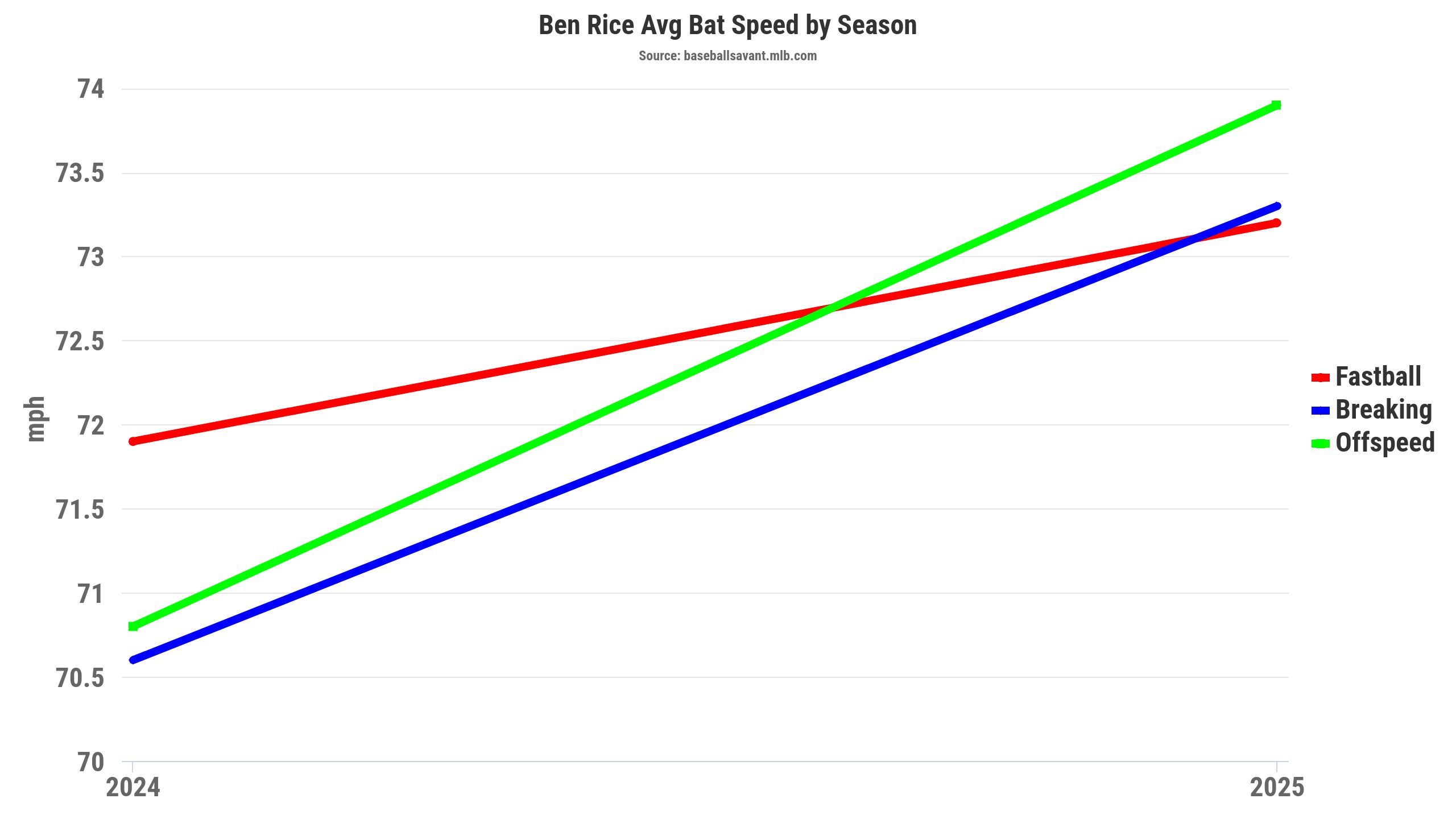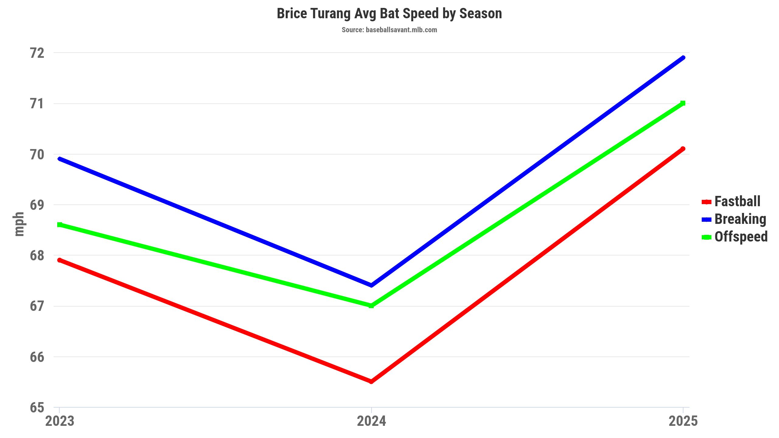 Specifically, Turang was crushing fastballs, with a .423 wOBA (.381 xwOBA), 8.2 percent barrel rate, and 70.1 mph bat speed in 2025. That's significantly better than Turang's skills and results against fastballs in 2024, with a .308 wOBA (.294 xwOBA), 1.9 percent barrel rate, and a 65.5 mph bat speed.