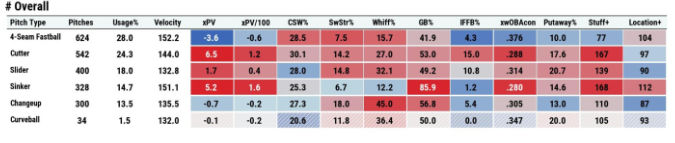 His fastball was extremely effective for a sinkerballer, generating a 9.6 SwStr% and 56.9 Zone%. Finally, his slider was his best wipeout offering with a 21.2 SwStr%, 34.7 Zone%, and 39.6 chase%.