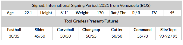 The fastball isn't great, but it's improved substantially since he was first signed. Back then, he topped out at 85 mph. Last year, he sat at 91 and topped out at 94, giving him something resembling MLB velocity even if he's still below-average. If it ticks upward again, he could have a real weapon.