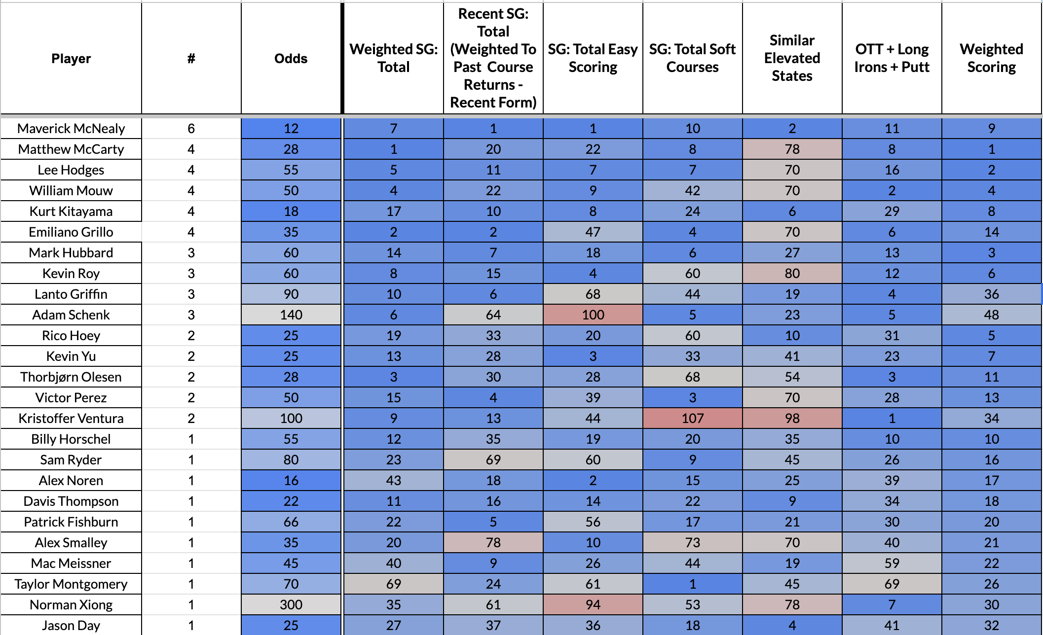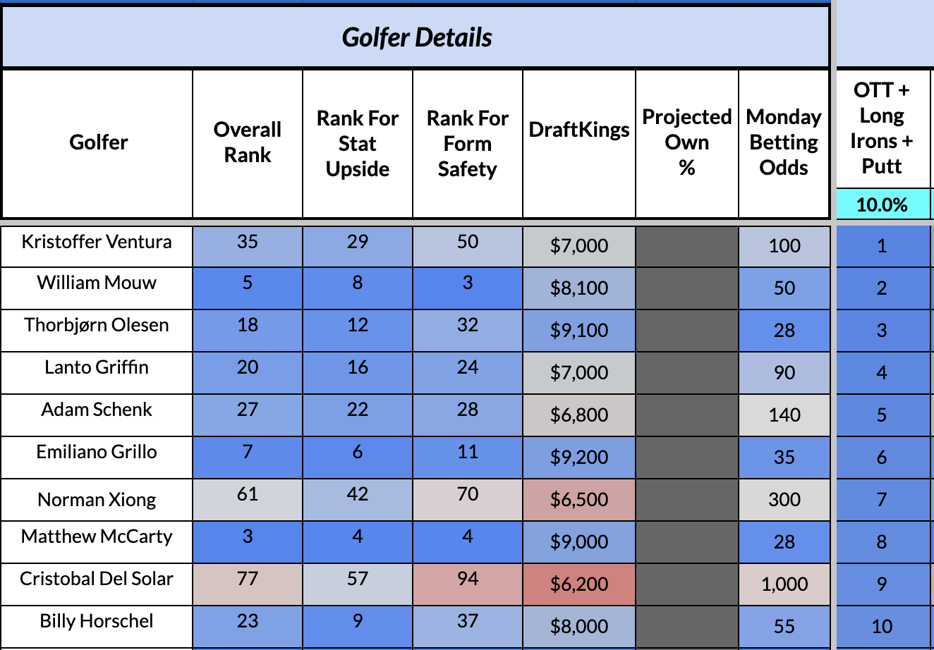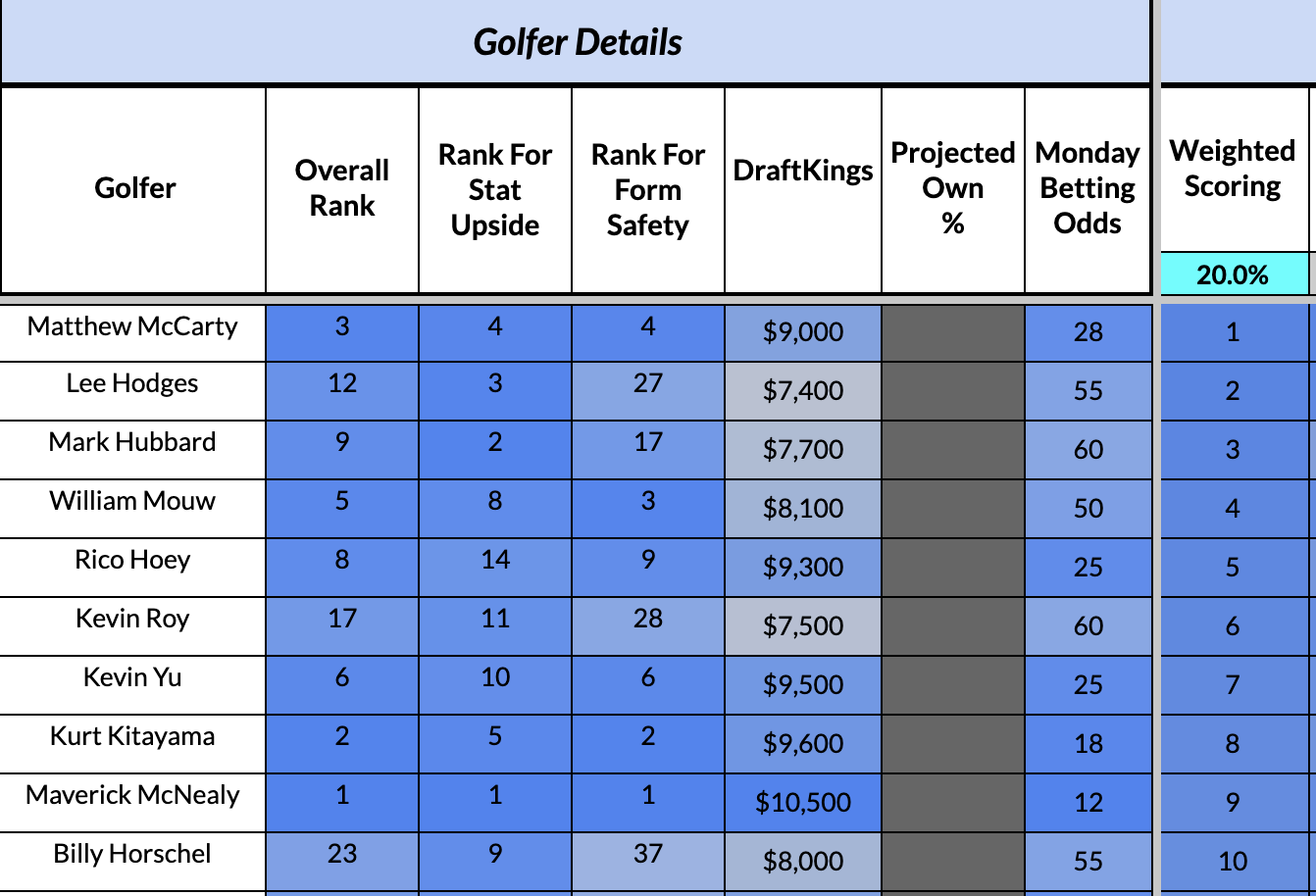 • A powerful and interactive data spreadsheet that allows users to input data to create custom rankings and models for golf. If you are considering signing up, take a look at this how-to guide on everything you can find weekly inside my pre-tournament model. The sheet is loaded with sortable and weighable information to help you in all sectors of the market.
