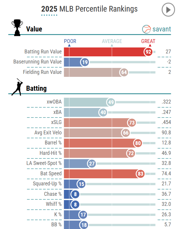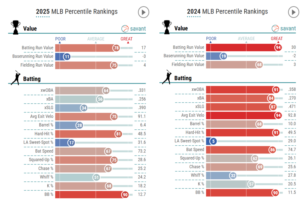 However, Contreras dealt with an injured finger that really hampered his production in 2025. He only had a 113 WRC+, and all of his power metrics were down across the board.