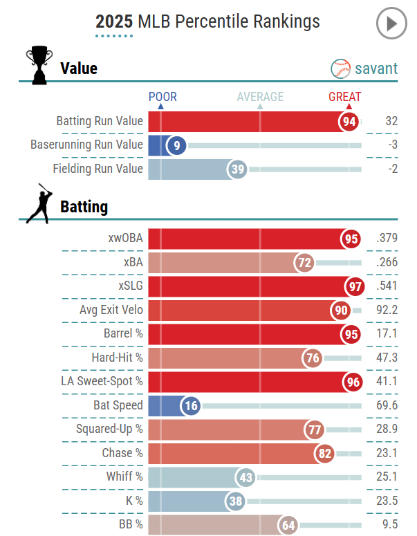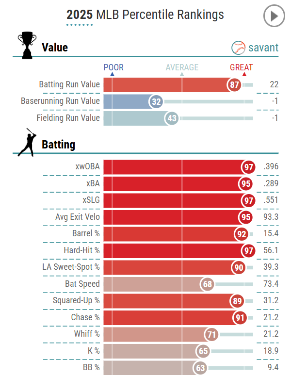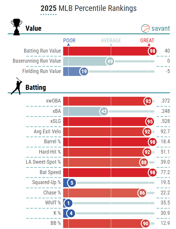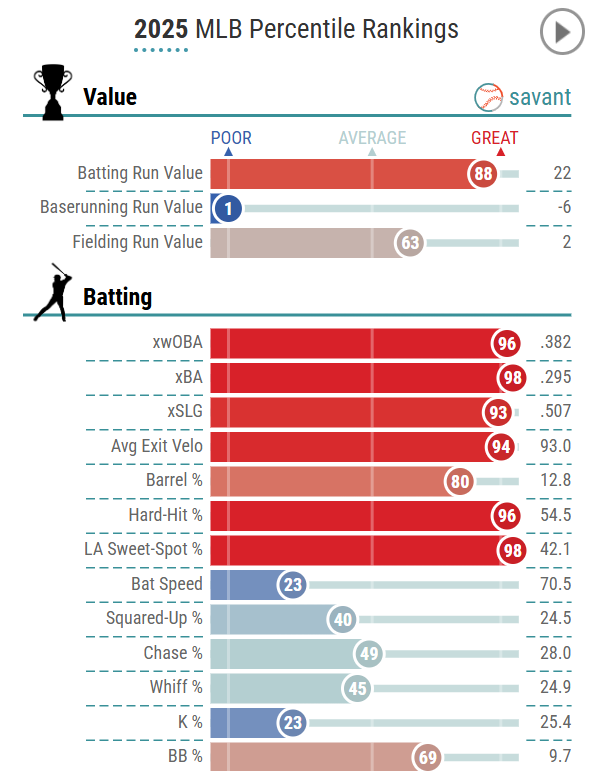 He has big-time power for a player so young, as he had 23 HRs in 2024 and 25 HRs in 2025 in the minors. Also, an extremely small sample, but he basically hit everything hard when he got to San Francisco. He had a 68.8 percent hard-hit rate and 95.6 MPH Avg. EV (both would've been near the top of the league).