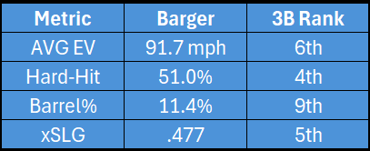 First and foremost, Barger's quality of contact metrics really stood out. Out of the 38 third baseman who had at least 300 plate appearances in 2025, Barger ranked 6th in AVG EV, 4th in Hard-Hit rate, 9th in Barrel rate, and 5th in xSLG. His power was consistent against all three pitch type too, as Barger posted an AVG EV above 91 mph against fastballs, breaking balls, and offspeed pitches. He also had a 116.5 mph MAX EV (97th percentile) and a .428 xwOBACON, which is was 59 points above league-average.