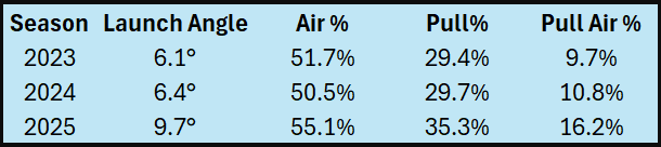 Even with the surface stats dipping over the last two seasons, even when you factor in the few games played, one area for Riley that has remained consistent is his quality of contact metrics. In 2025, Riley posted an elite 15.2% barrel rate, 92.3 mph AVG EV, and a 50.2% hard-hit rate with a 93rd percentile bat speed. Those quality of contact metrics were all in the Top-12% of hitters in baseball this past season. Riley also has ideal batted ball angles with a 65.4% air rate, 42.6% pull rate, and a 24.2% Pull-Air rate.