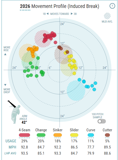 Against the Dodgers, he pounded lefties with the sinker and slider 50% of the time, while he attacks righties with his four-seamer, changeup, and cutter.