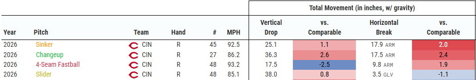 Lowder has featured a heavy sinker-slider mix to righties this season, while he leads with the four-seamer to lefties and mixes in all three of his other pitches equally. Lowder posted some solid groundball rates in the minors with his sinker-heavy approach, but has yet to do so at the big league level, and his 53% FB% so far this year is a bit worrisome for a pitcher in Cincinnati's homer-friendly ballpark.