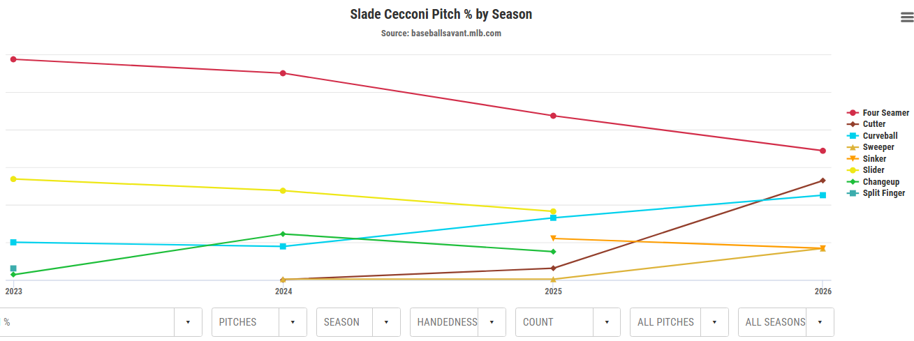 This year, it looks like he's continuing the trend of lowering his four-seam usage, while throwing a lot more cutters, curveballs, and sweepers. He's primarily fastball, cutter, curveball to lefties, and has mixed in both the sweeper and sinker to righties.