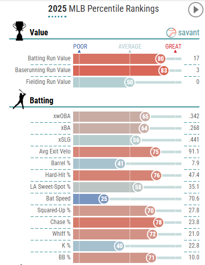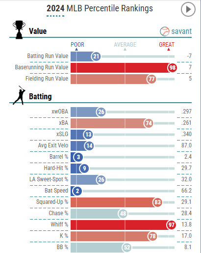 That being said, the noise in his profile isn't great. He's horrible against lefties with a 59 WRC+ against them. He also has a poor approach at the plate, with a second percentile chase rate and a fourth percentile walk rate. Crow-Armstrong is an intriguing player who will likely always be a good real-life player due to his defense. He will provide good power and speed for fantasy, but will likely hover around being a league-average bat for most of his career.