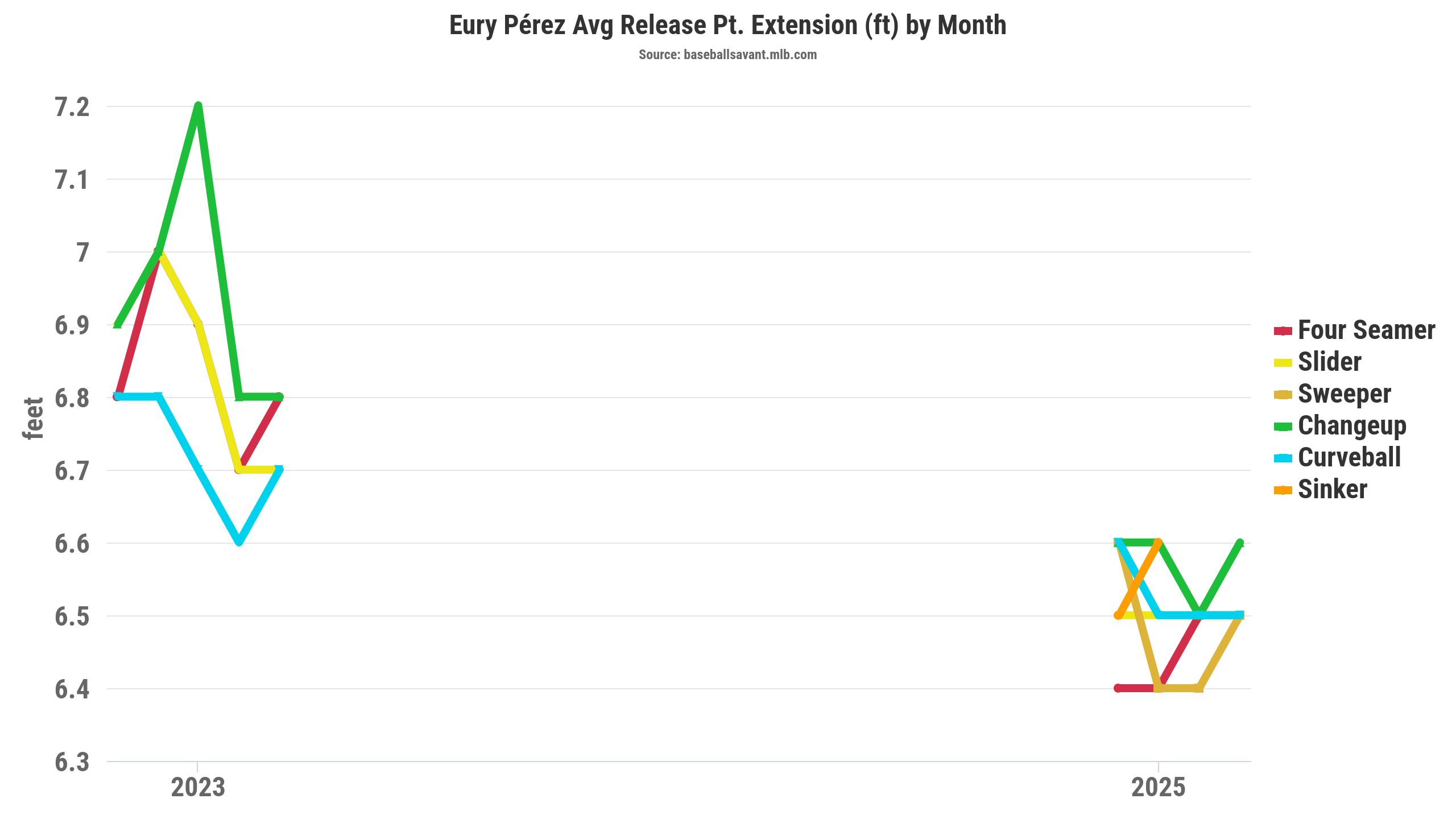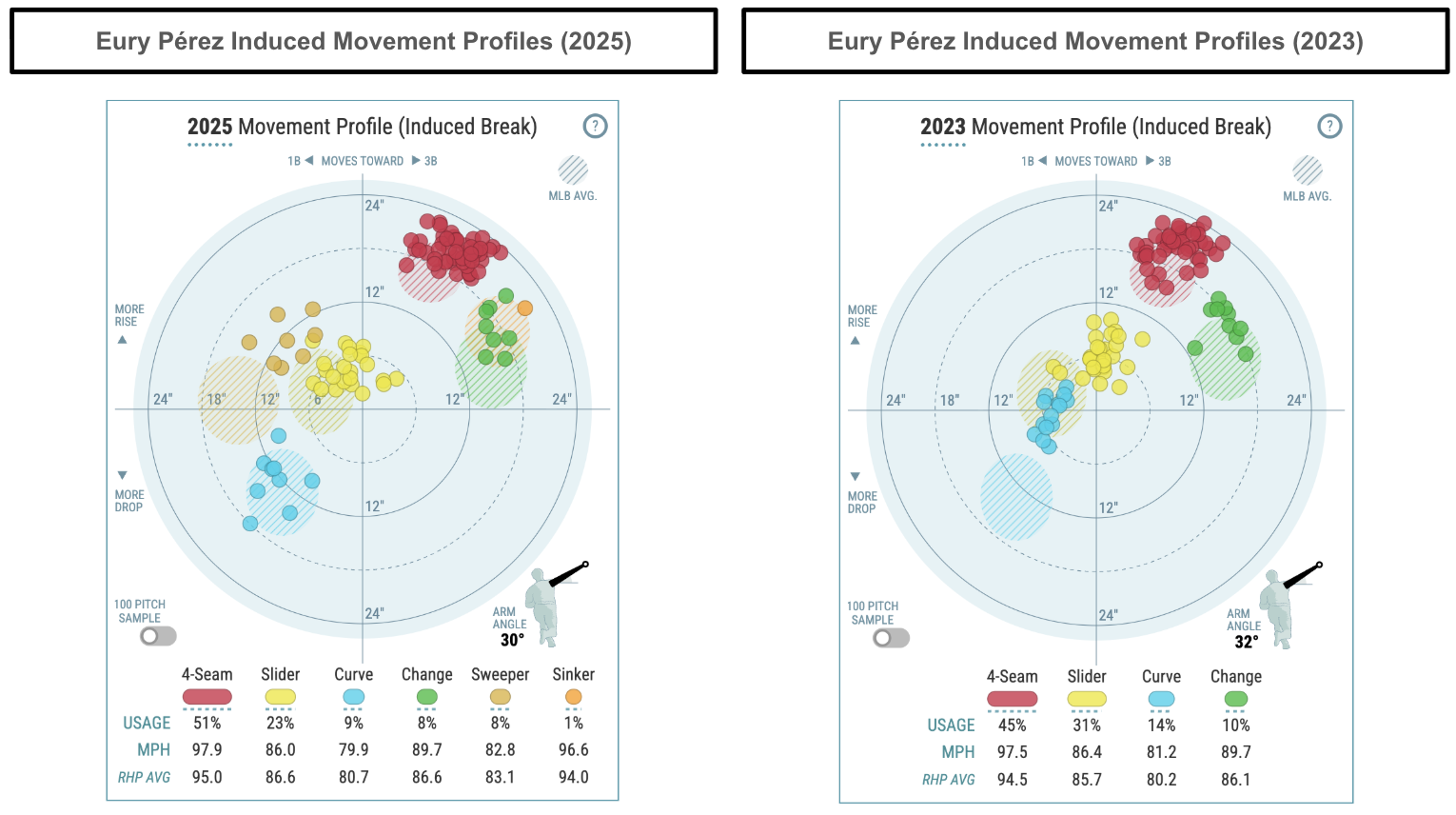 We haven't even discussed Pérez's electric four-seamer at 97-98 mph, coming from a low arm slot (30 degrees) while generating an above-average 17.7 inches of induced vertical break (IVB). The league average for four-seam IVB hovers around 16 inches. It's worth noting that Pérez lost almost five inches of extension (4.8 inches) in 2025.