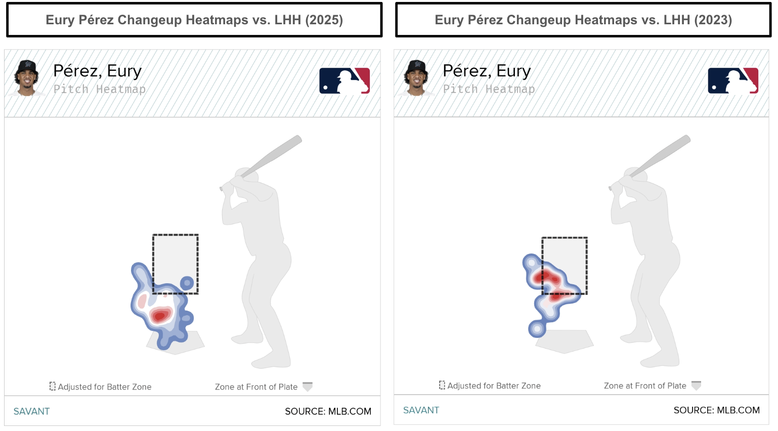 In the visual above, Pérez's changeup heatmaps against left-handed hitters in 2023 were drastically different in 2025. It could be that Pérez struggled with his command as he recovered from Tommy John surgery in 2025. There's a good chance opposing hitters will look at Pérez's zone rates and locations because they might layoff the changeup if they can identify it.