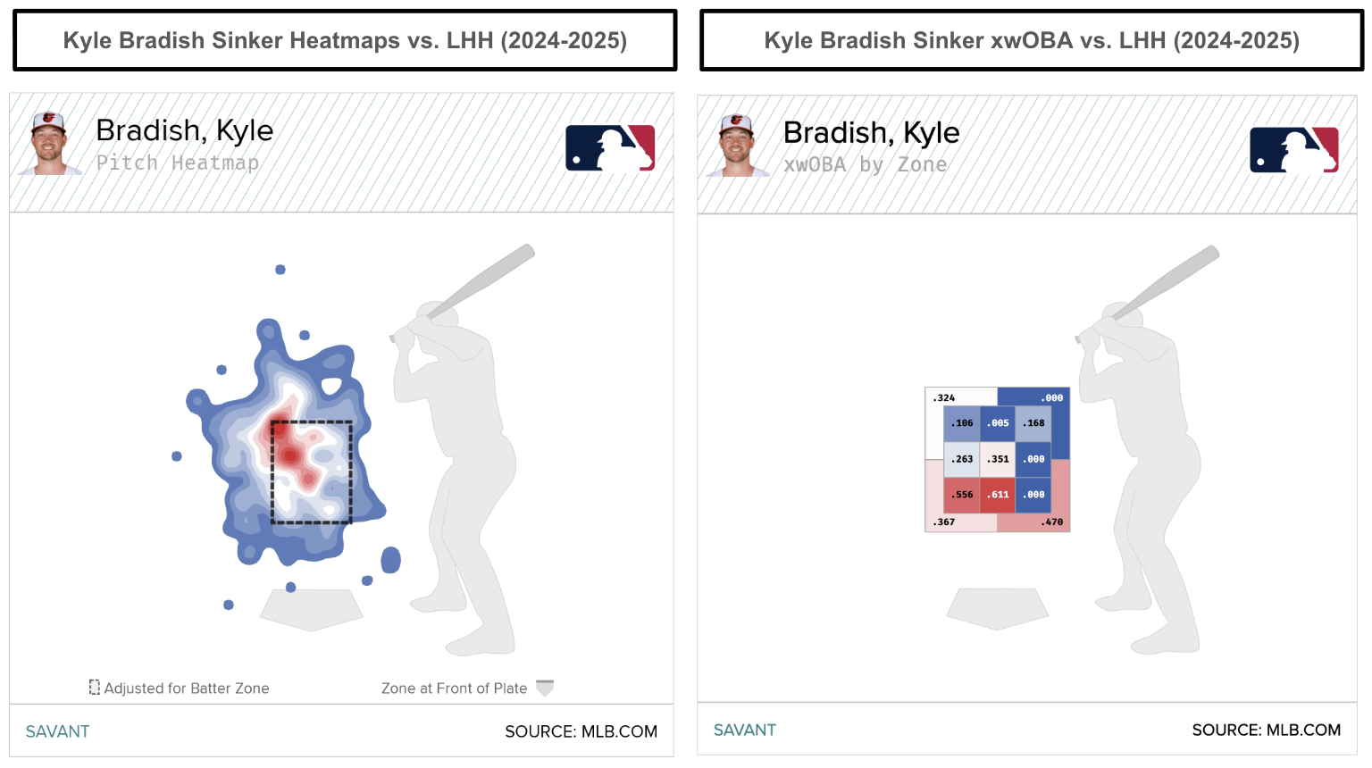Why does Bradish's sinker matter against left-handed hitters? It's mainly because he has located the sinker high and away from left-handed hitters over the past two seasons. That coincides with Bradish's sinker, allowing quality results, especially when thrown away from lefties.