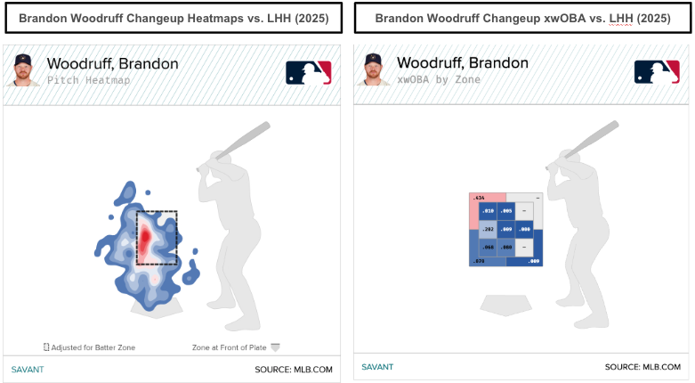 He'll need to rely on pristine command if the velocity doesn't return in 2026. The visual above shows Woodruff commanding the changeup well against left-handed hitters, leading to quality results (.050 wOBA, .099 xwOBA). Woodruff maintained his arm angle, yet his horizontal release point was nearly two inches (1.9) farther away from his midline when throwing the changeup.