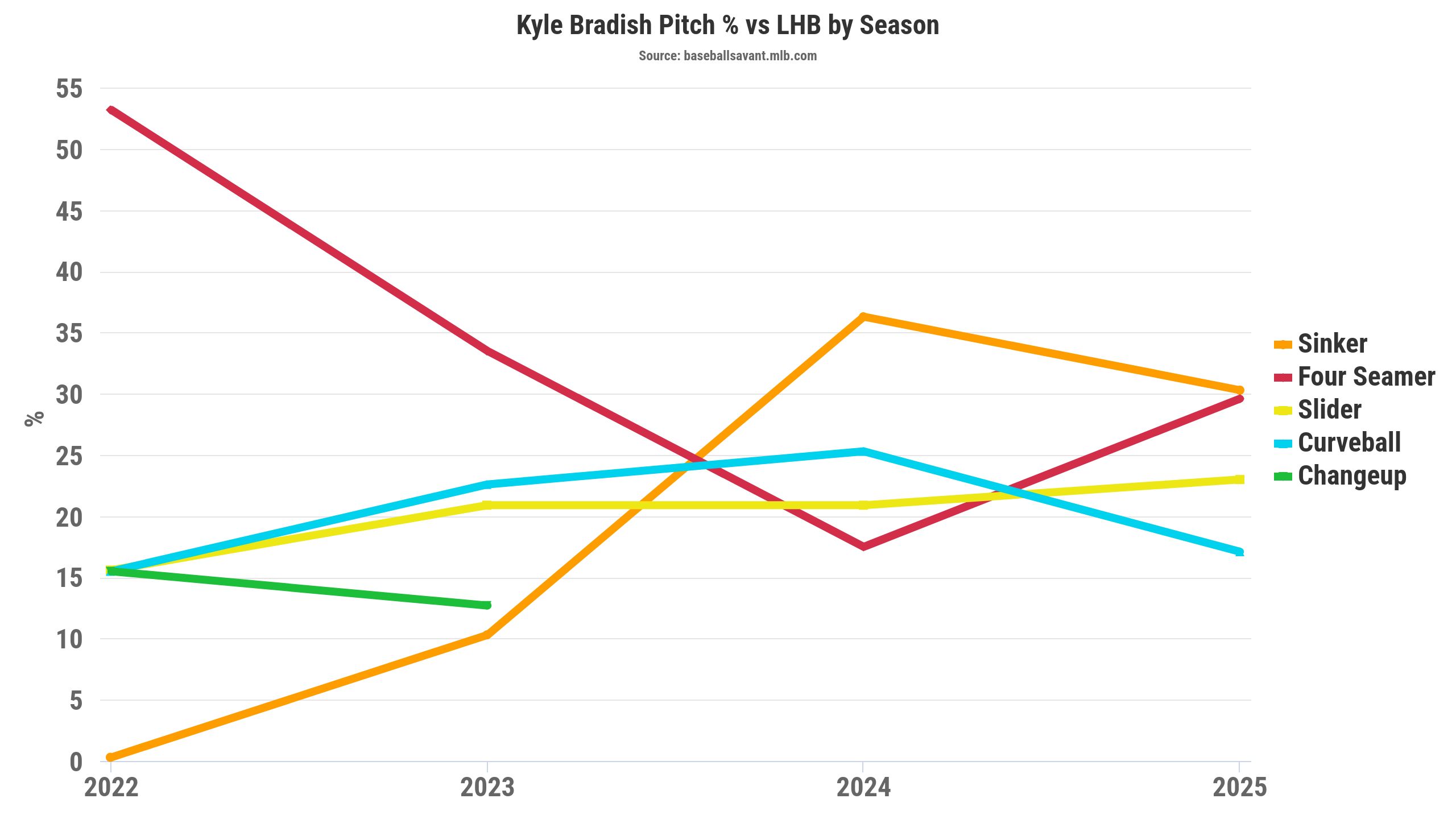 It might seem like Bradish could struggle against left-handed hitters. However, Bradish upped his sinker usage to lefties in 2024 (36.3 percent) and in 2025 (30.3 percent). That's significantly higher than Bradish's sinker usage at 10.3 percent in 2023.