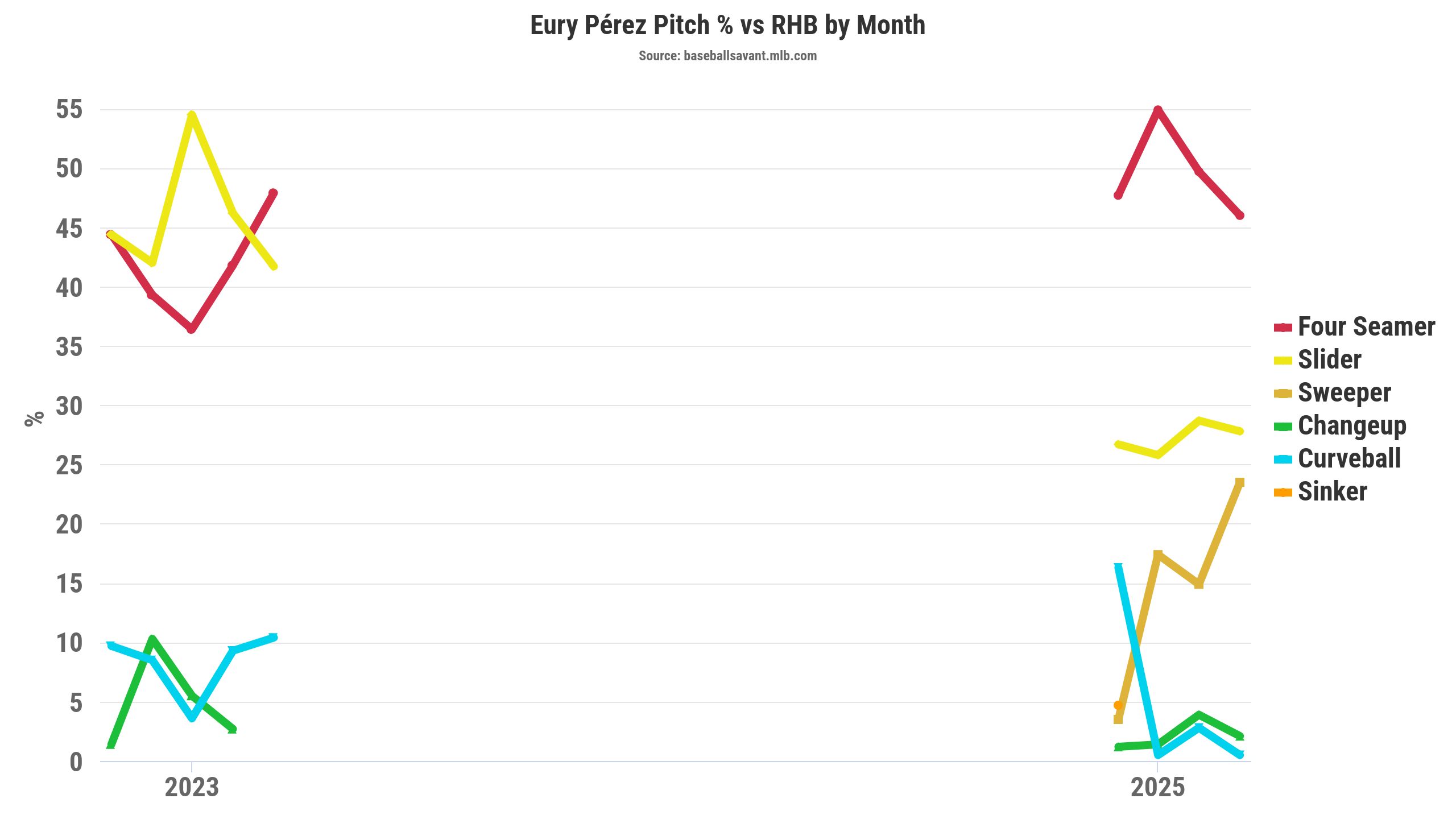 Pérez went from mainly throwing sliders (44.3 percent) and four-seamers (42.3 percent) against righties in 2023 to tossing four-seamers (50.1 percent), sliders (27.3 percent), and sweepers (16.6 percent) in 2025. Since Pérez threw a gyro-like slider, he introduced a sweeper that moves more toward his glove side, given the induced movement profiles.