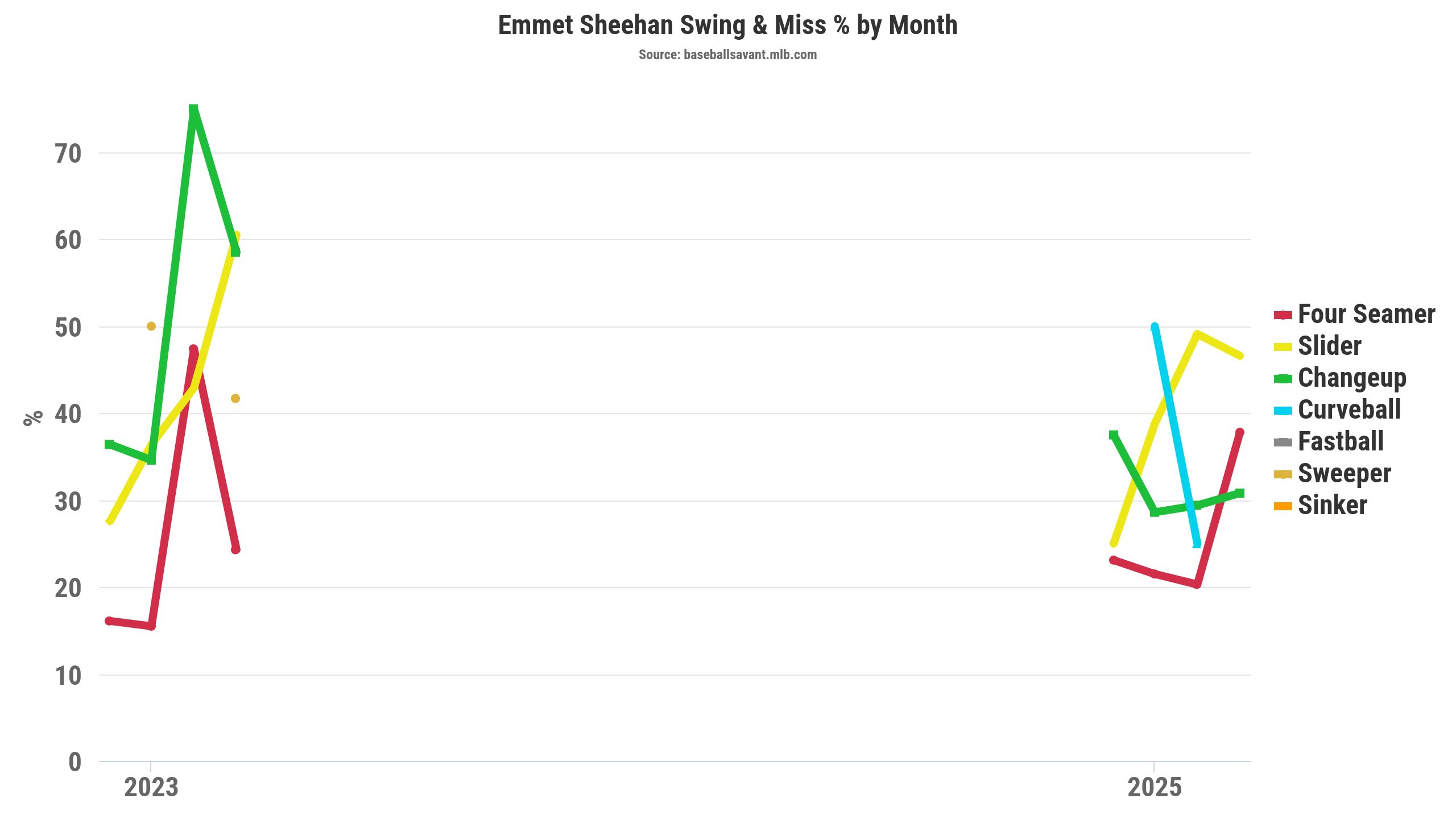 The changeup lost whiffs in 2025, inducing a swinging-strike rate of 13.6 percent, down from 22 percent in 2023. That's partly because Sheehan threw his changeup 3 mph harder in 2025 (86.2 mph) compared to 2023 (82.9 mph). Sheehan's changeup maintained its downward movement (35-36 inches), yet it lost over four inches of arm-side fade in 2025.