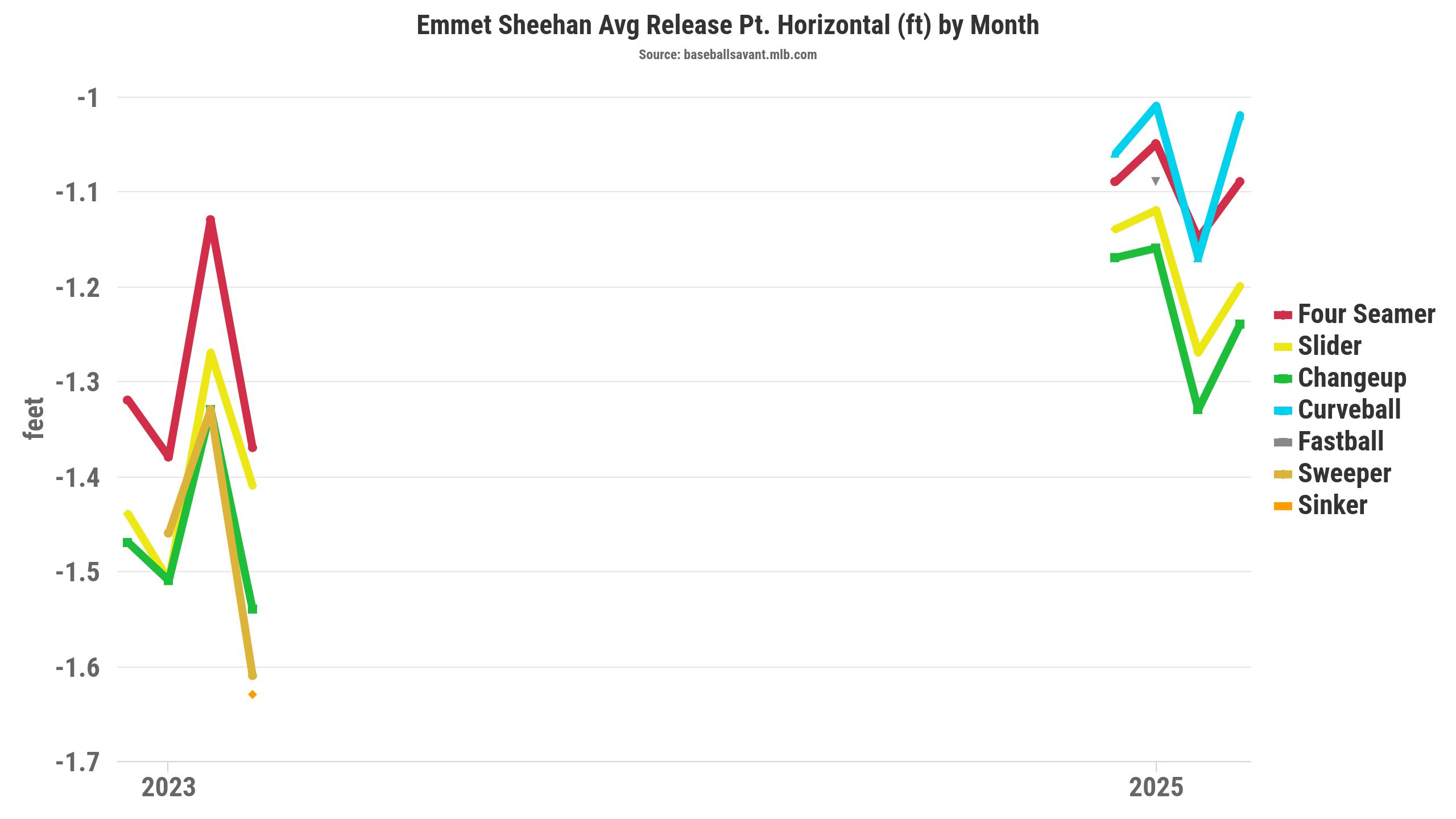 Sheehan raised his arm angle by five degrees (35.9 degrees) when throwing the four-seam in 2025. That's mainly because he brought his horizontal release point closer to his midline by over three inches while raising his vertical release by 1.7 inches. Theoretically, that could lead to Sheehan's four-seam jumping on hitters with the release point change and additional IVB.
