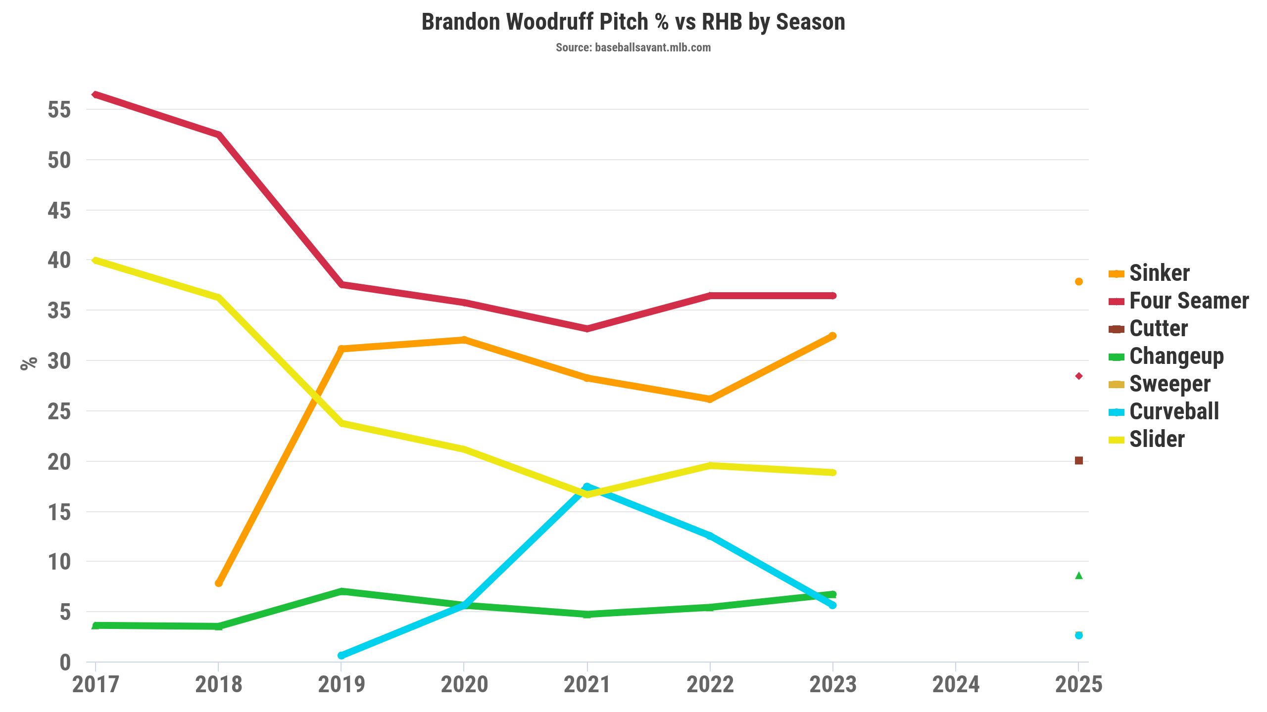 Woodruff added a cutter in 2025, throwing it 15.8 percent of the time. He seemed to have traded the slider for a sweeper and a cutter, though the cutter was most notable since he threw it 20 percent of the time to right-handed hitters. Woodruff's cutter has an above-average movement profile and closely resembles Ryan Pepiot, Tobias Myers, and Merrill Kelly.