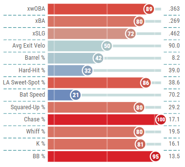 Wallner also showed strong plate discipline, walking at nearly a 12% clip (84th percentile) while improving his contact rate from 64% to 67%. While still below league average, the upward trend is encouraging. When Wallner does make contact, the results are loud. The former 39th overall pick in the 2019 draft posted a 13.8% barrel rate (85th percentile) and an average bat speed of 76.6 mph (96th percentile).