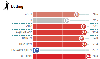 While the 22-year-old's home run projection of 37 is already pretty high, if any fantasy managers had unease about whether or not he could return to that threshold or even attain 45 HR again, a 92nd percentile average exit velocity (92.4) at his age and with the top bat speed in the majors should allay those concerns.