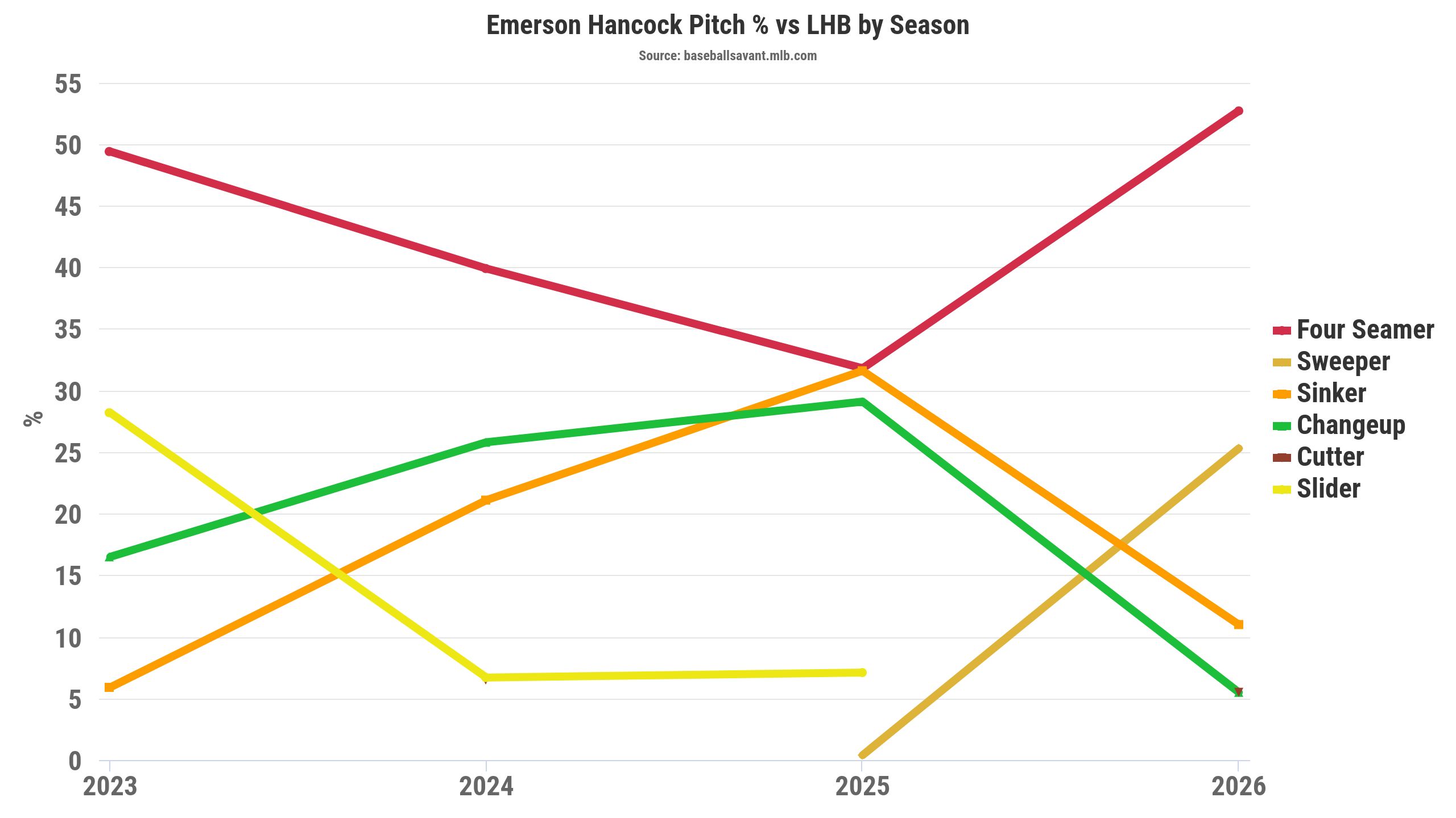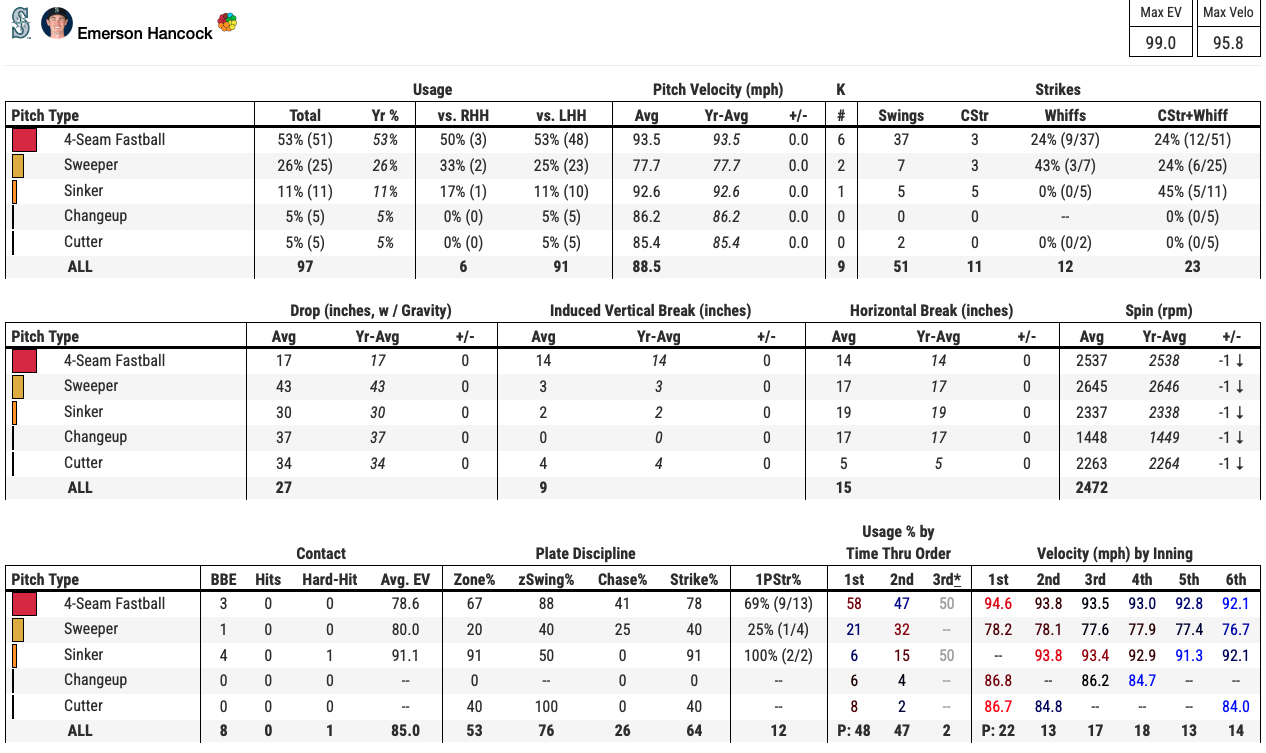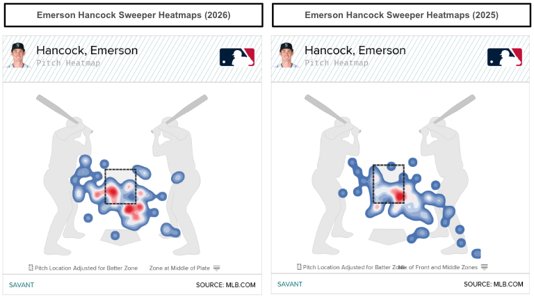 The pitch mix change in one outing was nice, but Hancock's sweeper movement profile shifted slightly. That's evident in Hancock's sweeper losing 1 mph of velocity while adding over 1 inch of drop and 1.5 inches of glove-side movement in 2026. Furthermore, Hancock's sweeper locations differed, as he threw them into the zone 20% of the time.