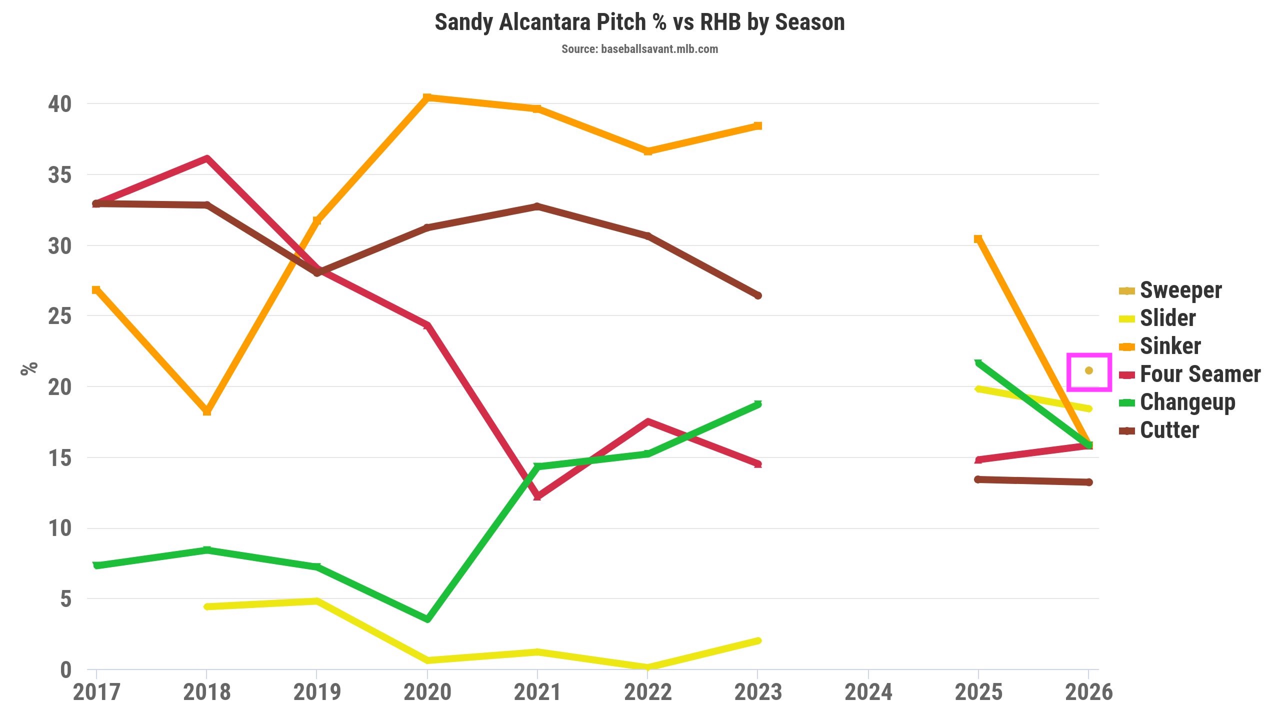 He threw his changeup over four inches lower than in 2025, similar to 2022 and 2023. Furthermore, Alcantara's changeup was thrown over three inches toward the middle of the plate, yet still low and below the zone. That makes hitters need to cover more vertical depth in the zone with the changeup location and movement profile change in 2026.