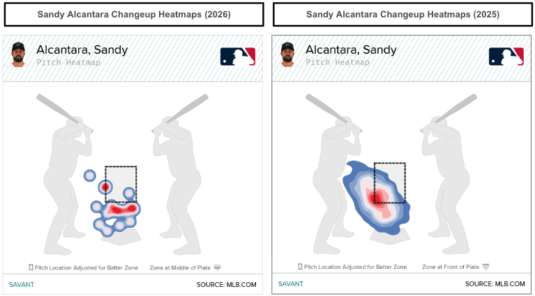 Keep tabs on Alcantara's new sweeper and changeup locations. The changeup is notable because it can elicit whiffs and generate plenty of groundballs. If Alcantara can maintain an above-average swinging-strike rate, generate grounders, and find success with the pitch-level changes, there could be a significant bounce-back season for him in 2026.