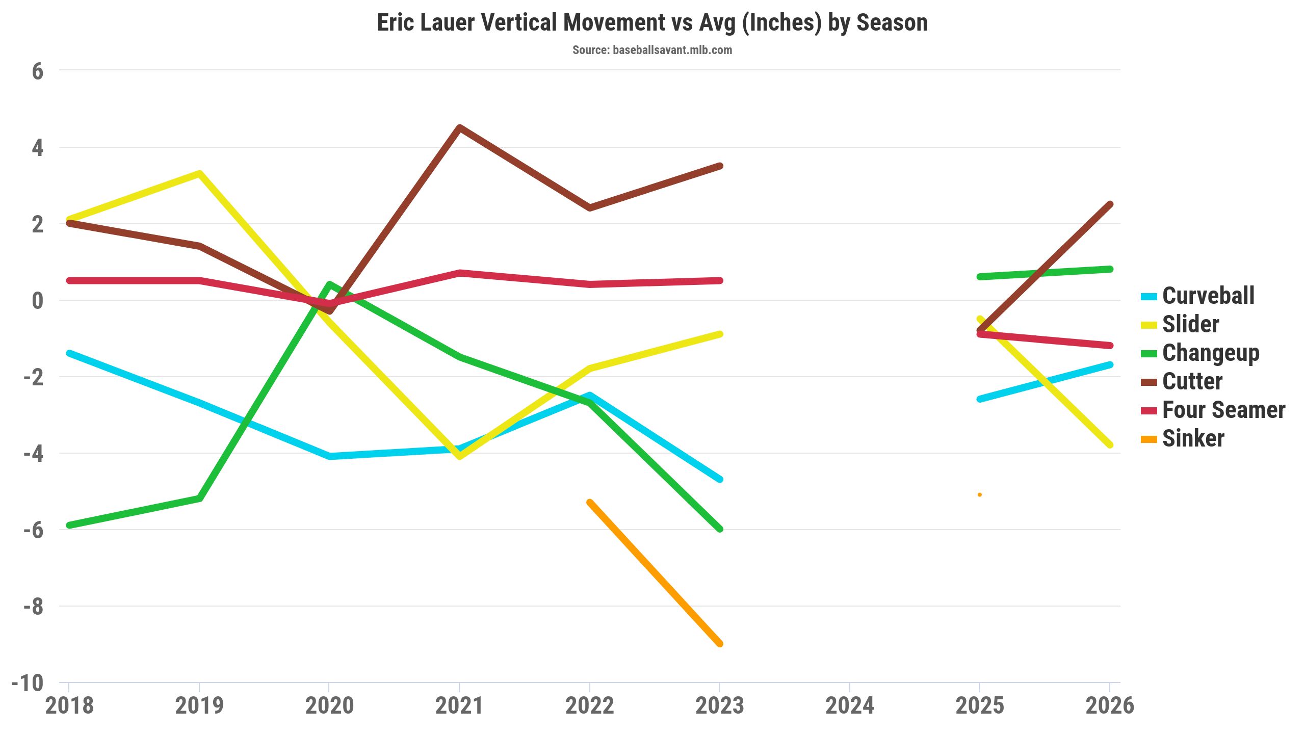 It seems like it's the year of the cutter early in the 2026 season. Lauer's cutter lost over five inches of downward movement while losing three inches of glove-side movement. We saw Lauer use a similar cutter from a velocity and movement standpoint in 2023 with the Brewers. Interestingly, the cutter results weren't great against right-handed hitters (.457 wOBA, .442 xwOBA), which he threw 34% of the time in 2023.