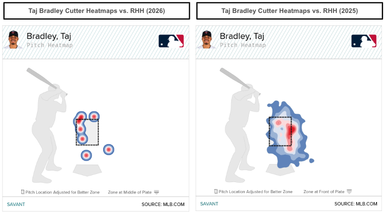 The heatmaps below show Bradley's cutter location volatility in his first 2026 outing compared to 2025 against right-handed hitters. That's further evident by Bradley's cutter having a 60 Location+ in 2026 compared to a 92 Location+ in his career.