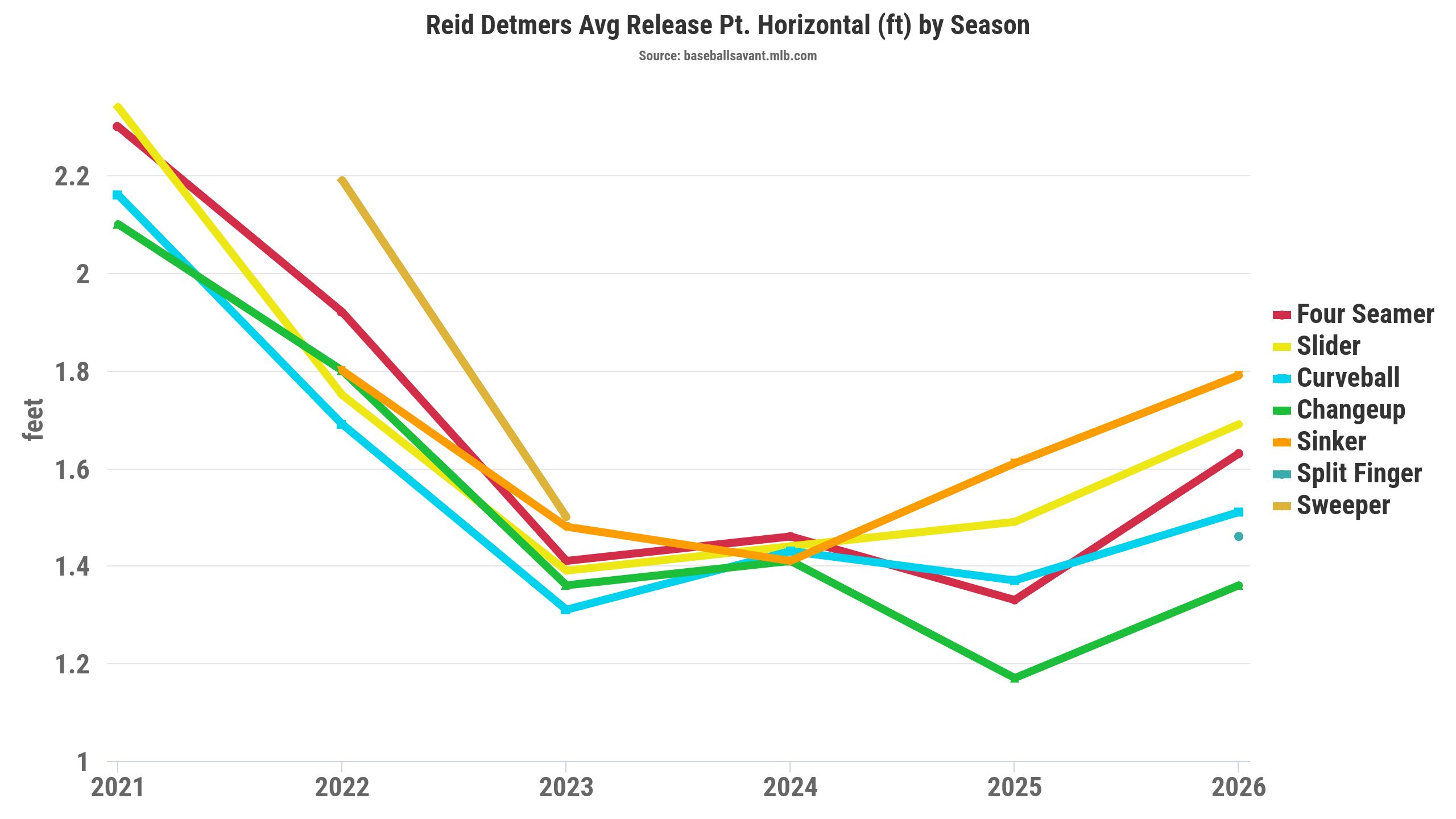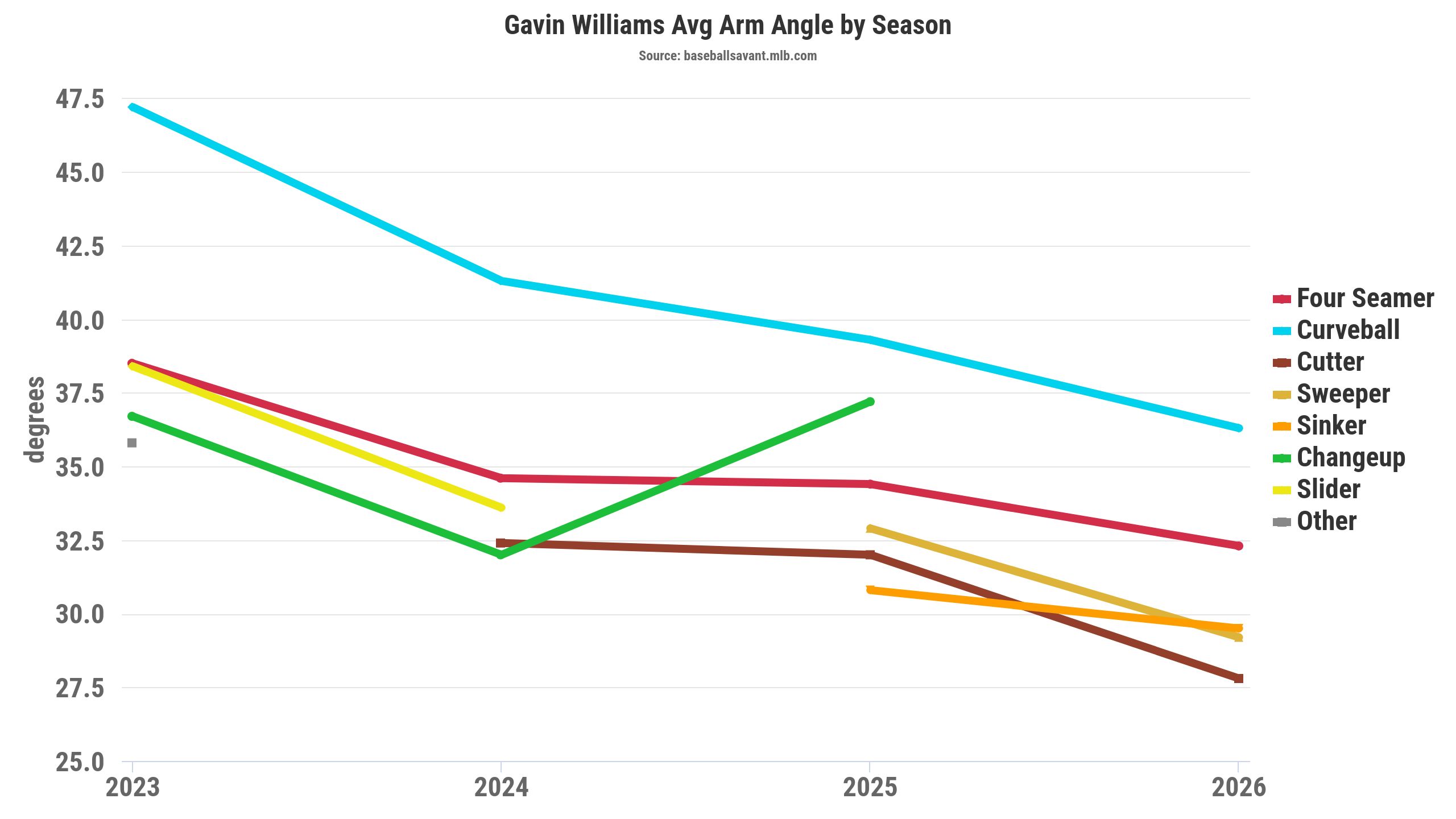 Williams lowered his arm angle by three degrees in 2026 compared to recent seasons. Interestingly, he maintained his horizontal release point, but dropped his vertical release point by almost two inches.