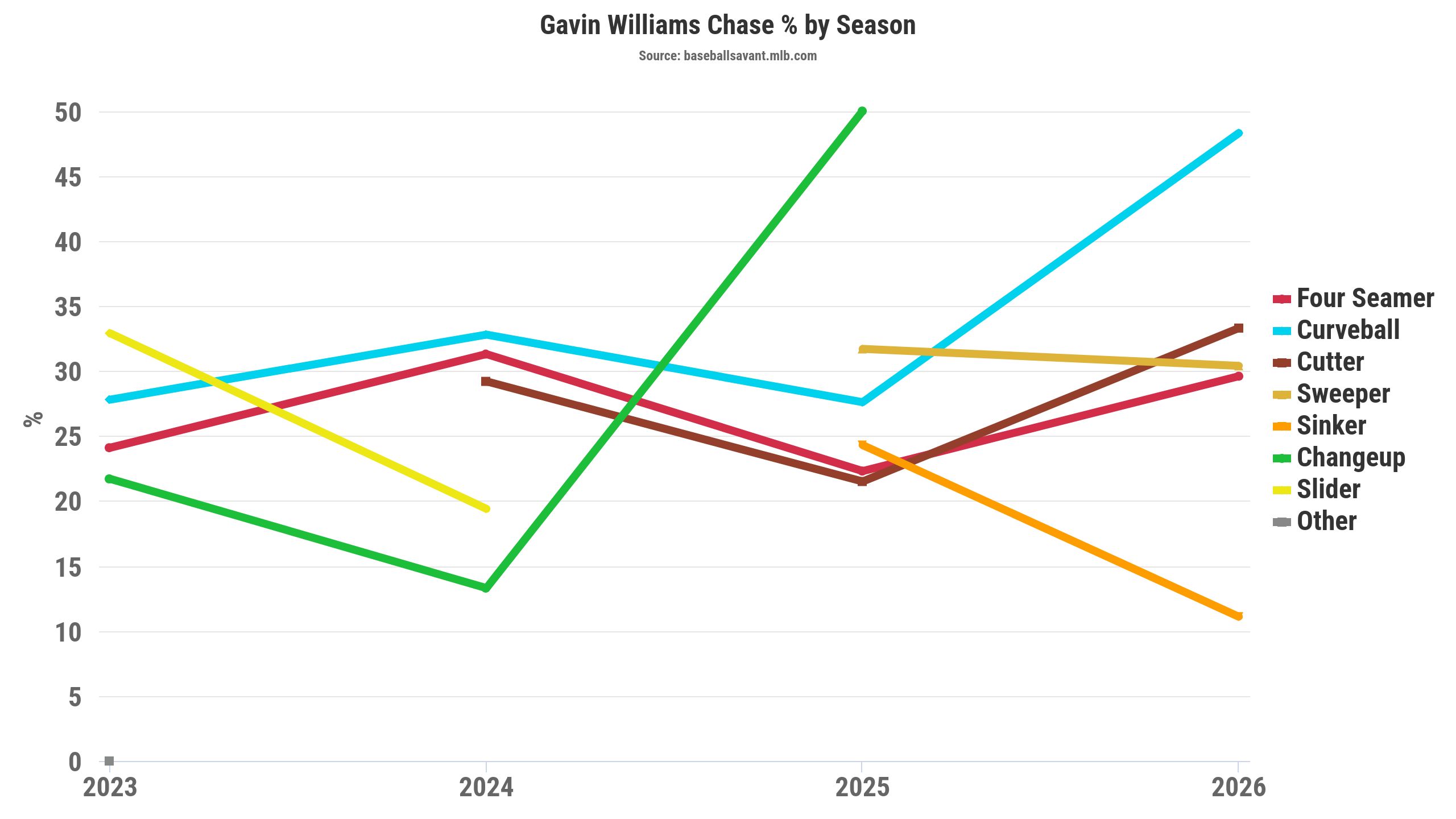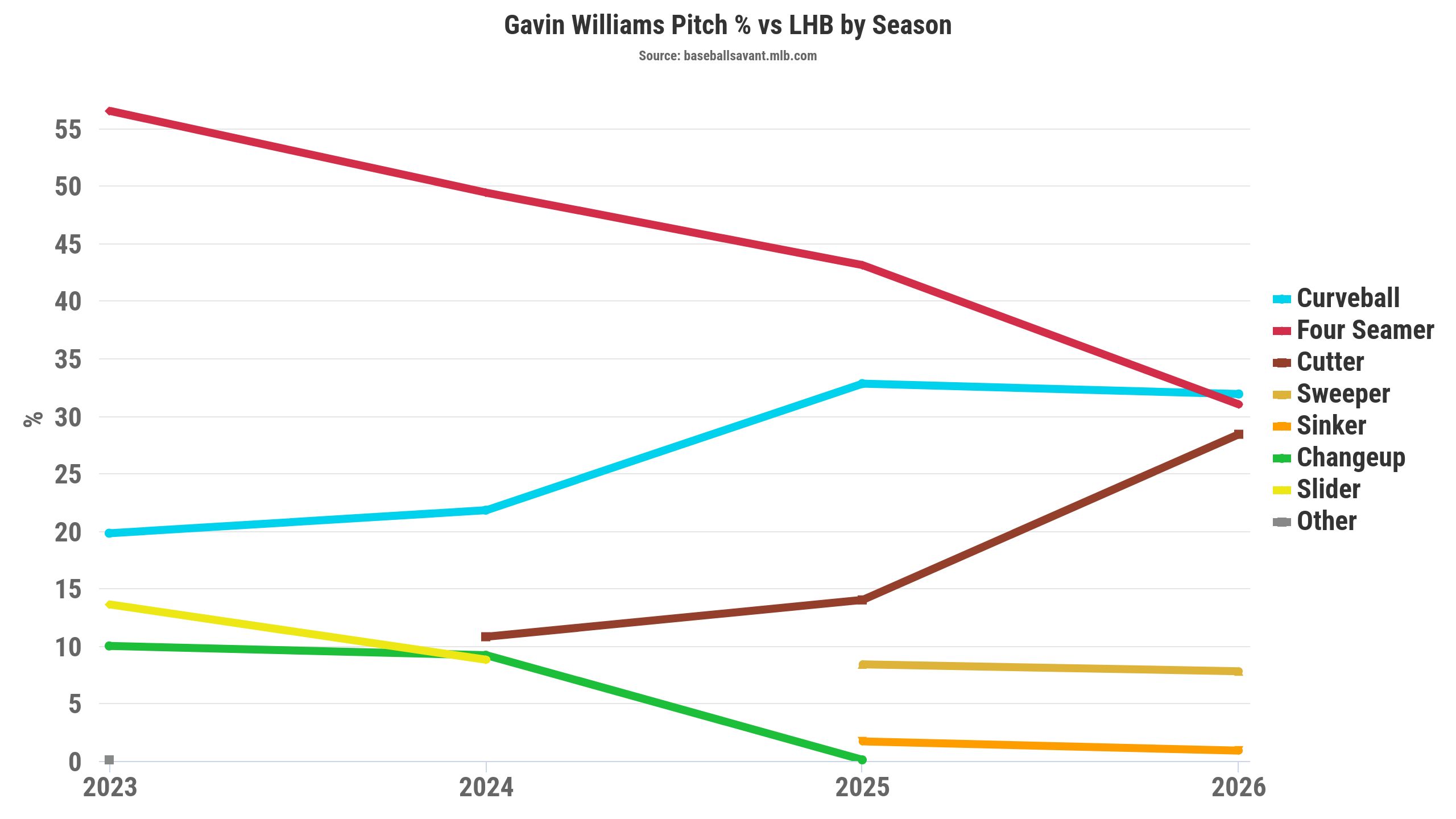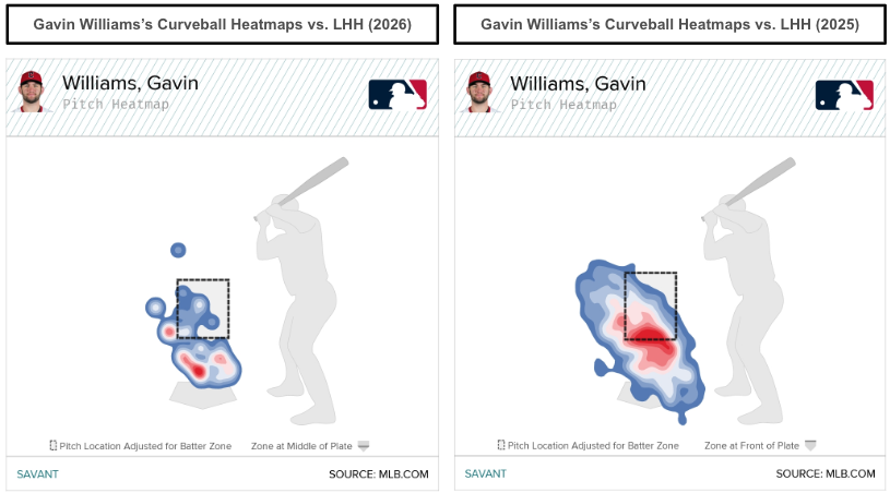 The curveball has historically been his best pitch against left-handed hitters, with a .146 wOBA (.220 xwOBA) in 2025 and .000 wOBA (.024 xwOBA) in 2026. If Williams' cutter can be a second effective offering to lefties, that increases our optimism.