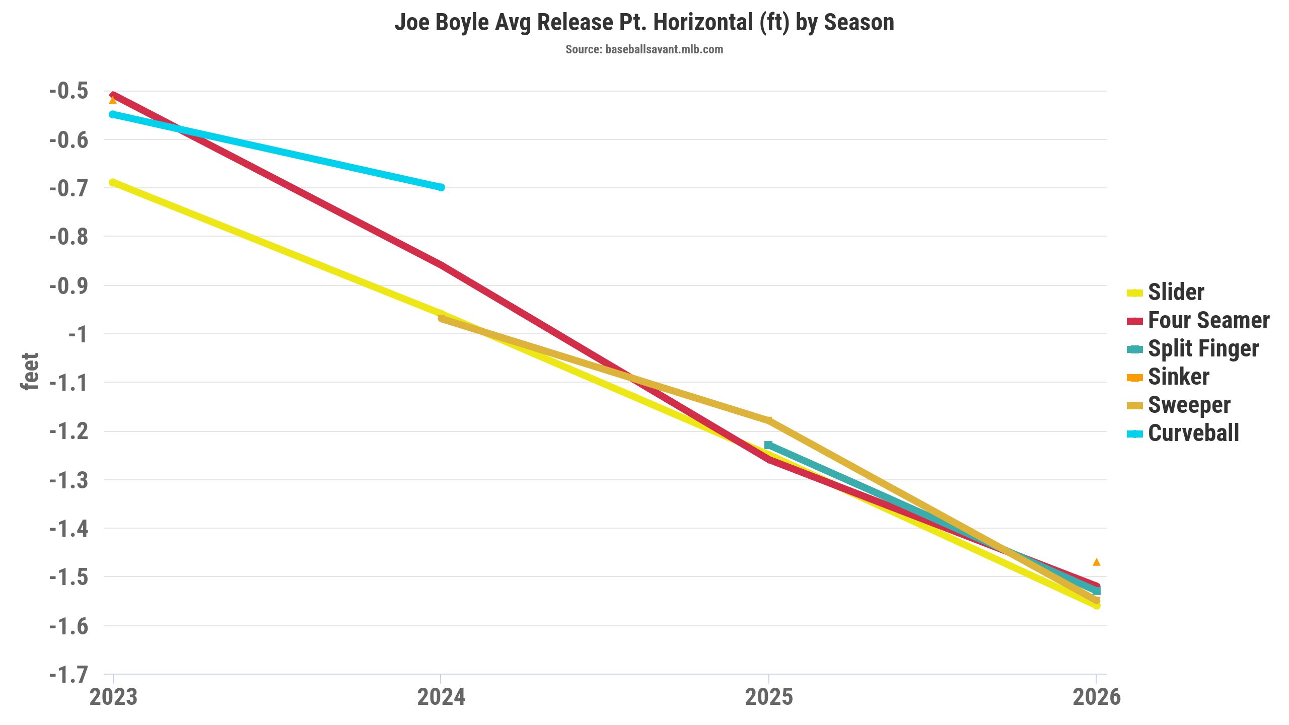 Boyle has been throwing from a lower arm angle (27 degrees), down from 32 degrees in 2025. That can be explained by Boyle's vertical release point dropping by three inches, with the horizontal release shifting over three inches farther from his midline.