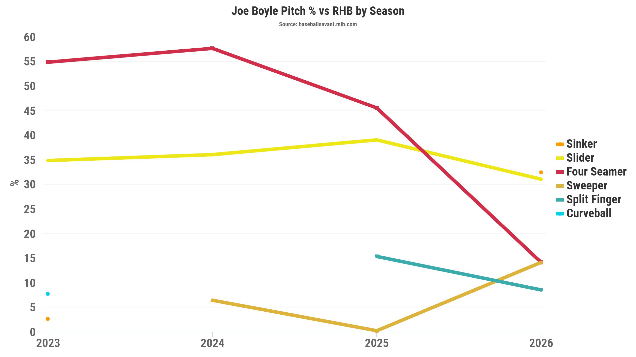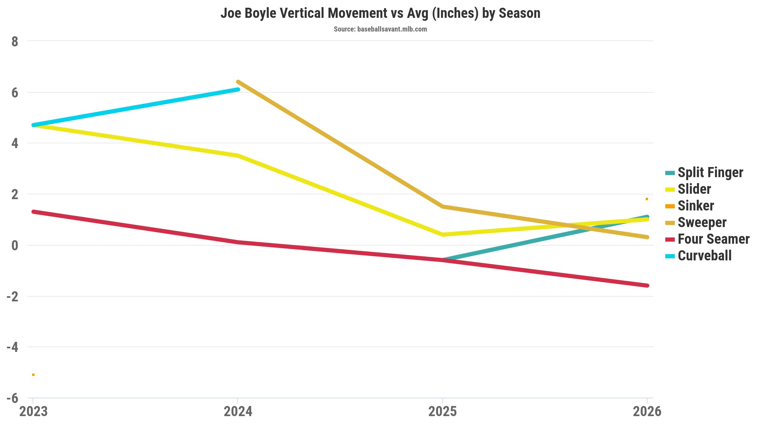 Sinkers typically help to generate groundballs, but that hasn't been the case in the early 2026 sample, with a 25% ground-ball rate. Furthermore, Boyle's sinker has been hit hard, with a .482 xwOBA (.180 wOBA), so the outcomes have been fluky. Command is an issue for Boyle, but the sinker's 105 Location+ leads his arsenal, so that's a pitch to monitor.