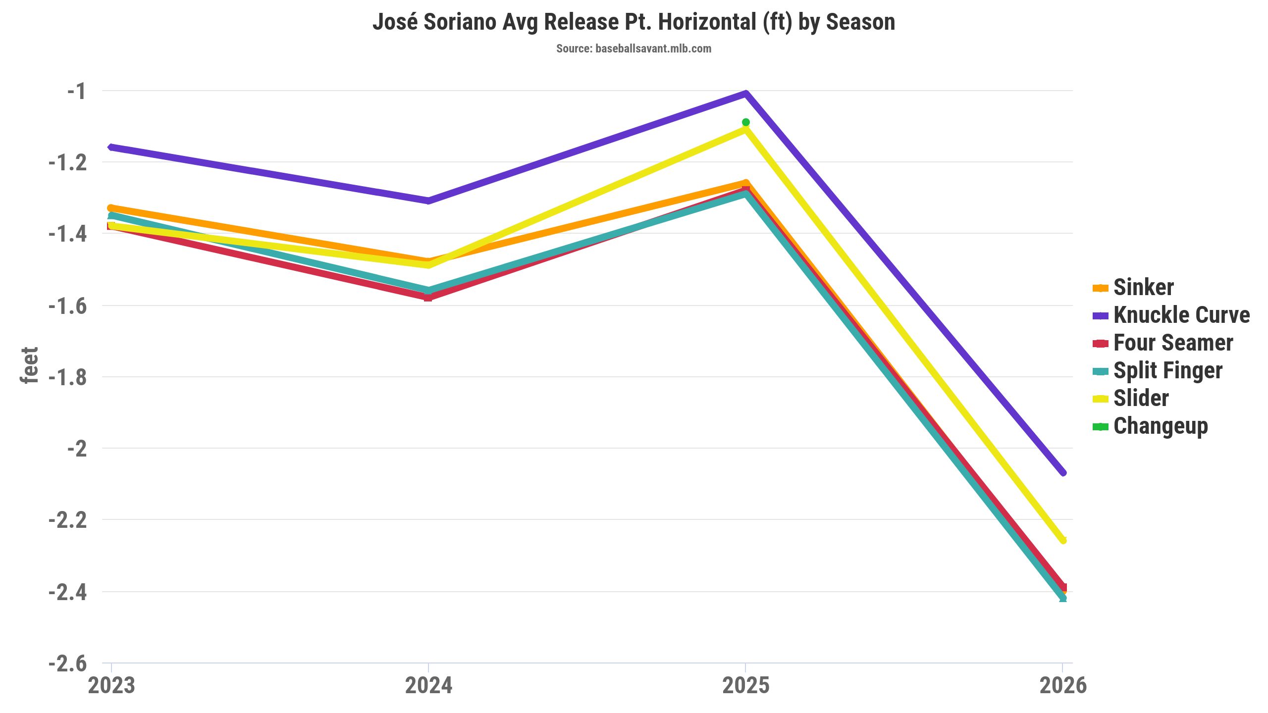 It's probably a minor adjustment, but we've noticed Soriano has been locating sinkers farther outside to left-handed hitters, which coincides with his horizontal release point shifting over 14 inches farther away from his midline. That's similar to Soriano's arm angle change when throwing sinkers toward right-handed hitters, shifting 13 inches away from his midline in 2026.