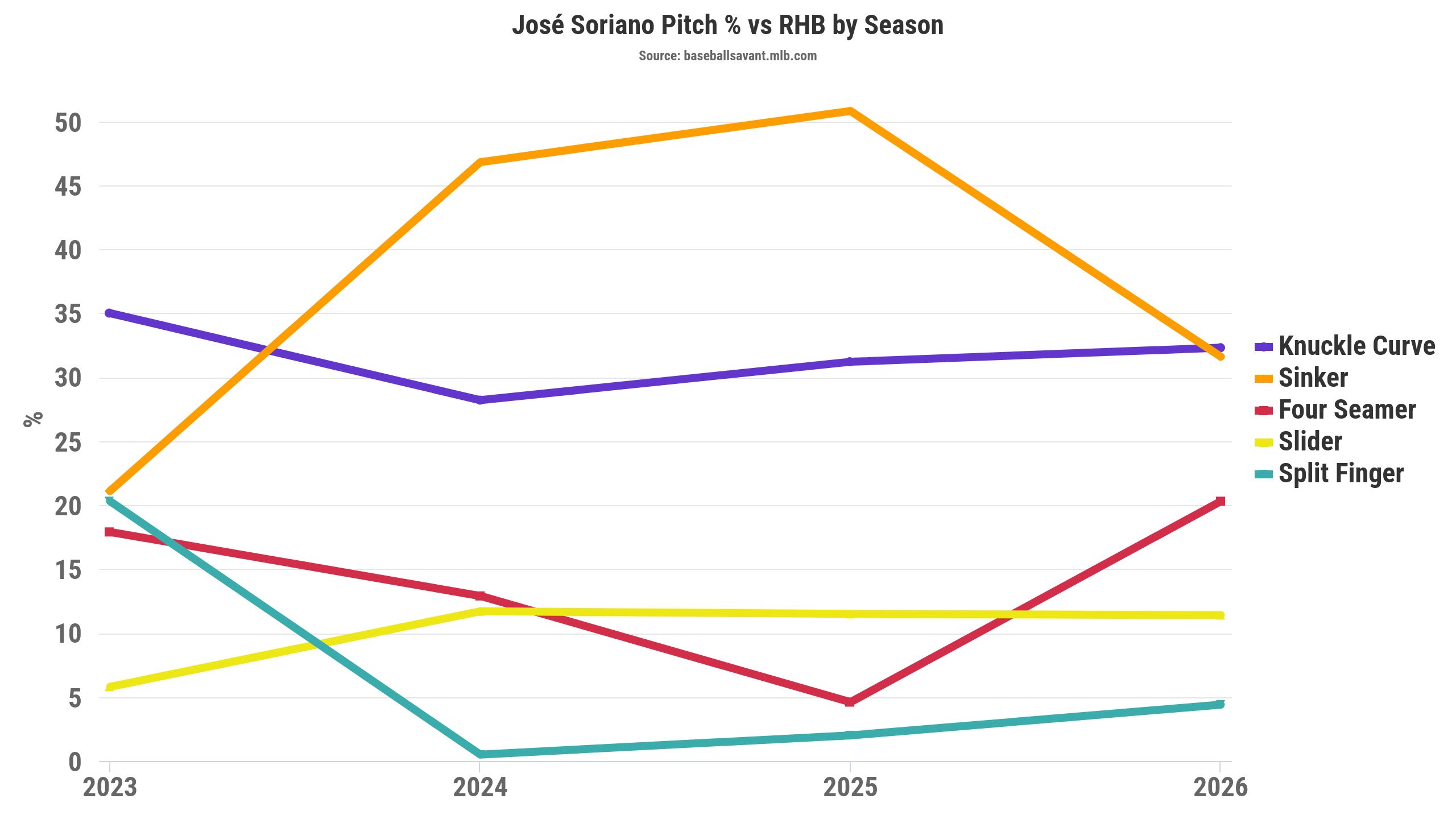 For context, Soriano threw sinkers (50.8%) and knuckle curves (31.2%) over 80% of the time in 2025 against righties.