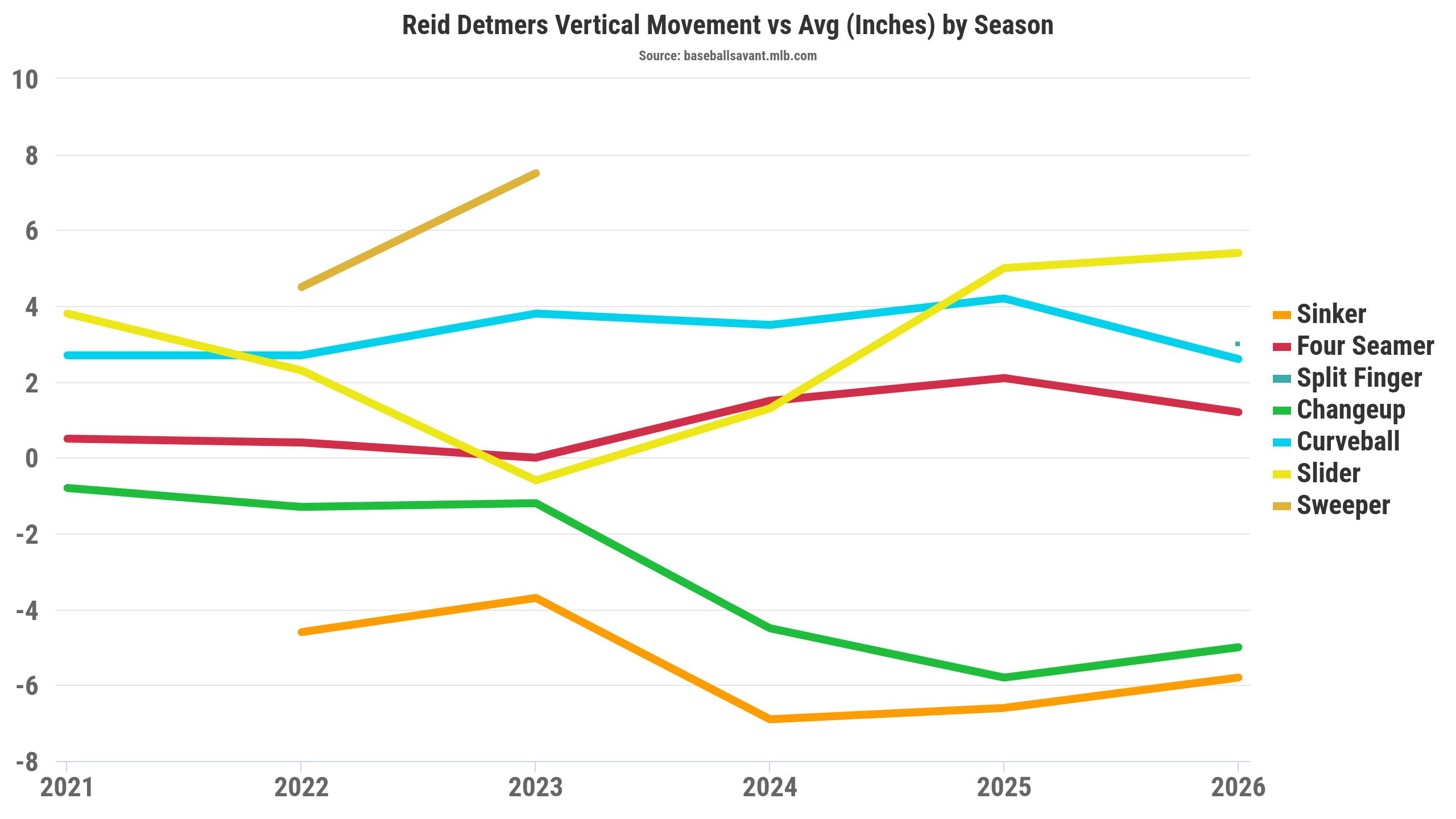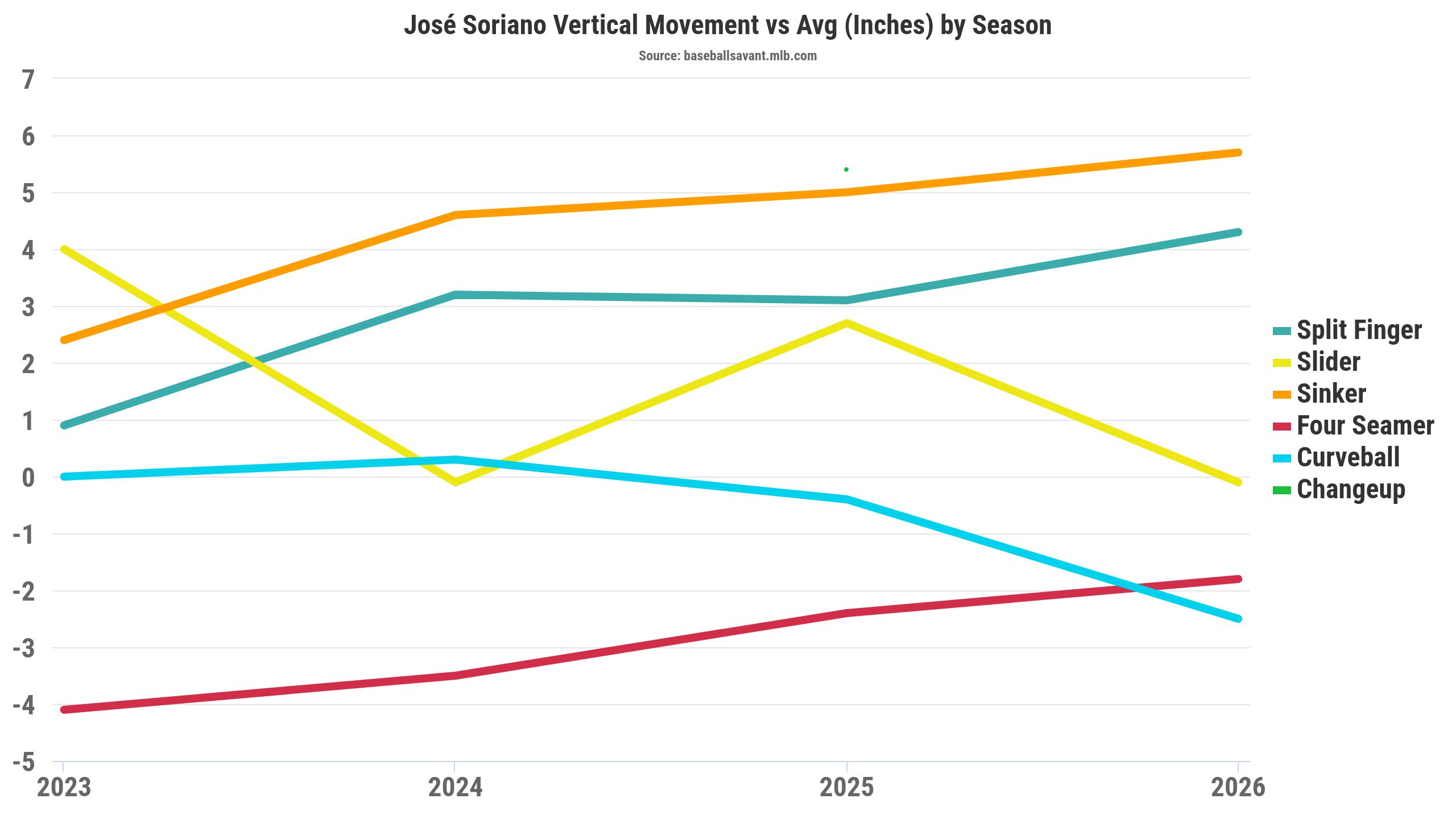 Opposite of Soriano's curveball, his splitter gained around three inches of downward movement in 2026. The splitter's spin rate hasn't shifted much (+50 RPM), so maybe Soriano's splitter downward movement regresses, or there's a grip change.