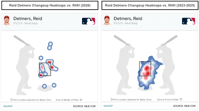Detmers started throwing more sliders to right-handed hitters (32.2%), up from 23.2% in 2025. The results have been positive in the early 2026 sample (.183 wOBA, .061 xwOBA) via the slider against righties.