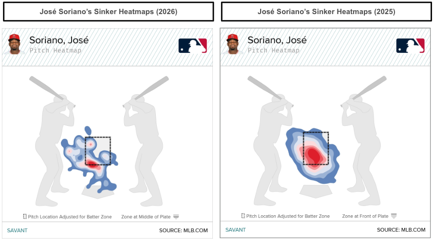It might be unsustainable for Soriano to maintain the higher swinging-strike rate, especially considering his sinker elicited a 15.7% swinging-strike rate early in 2026.