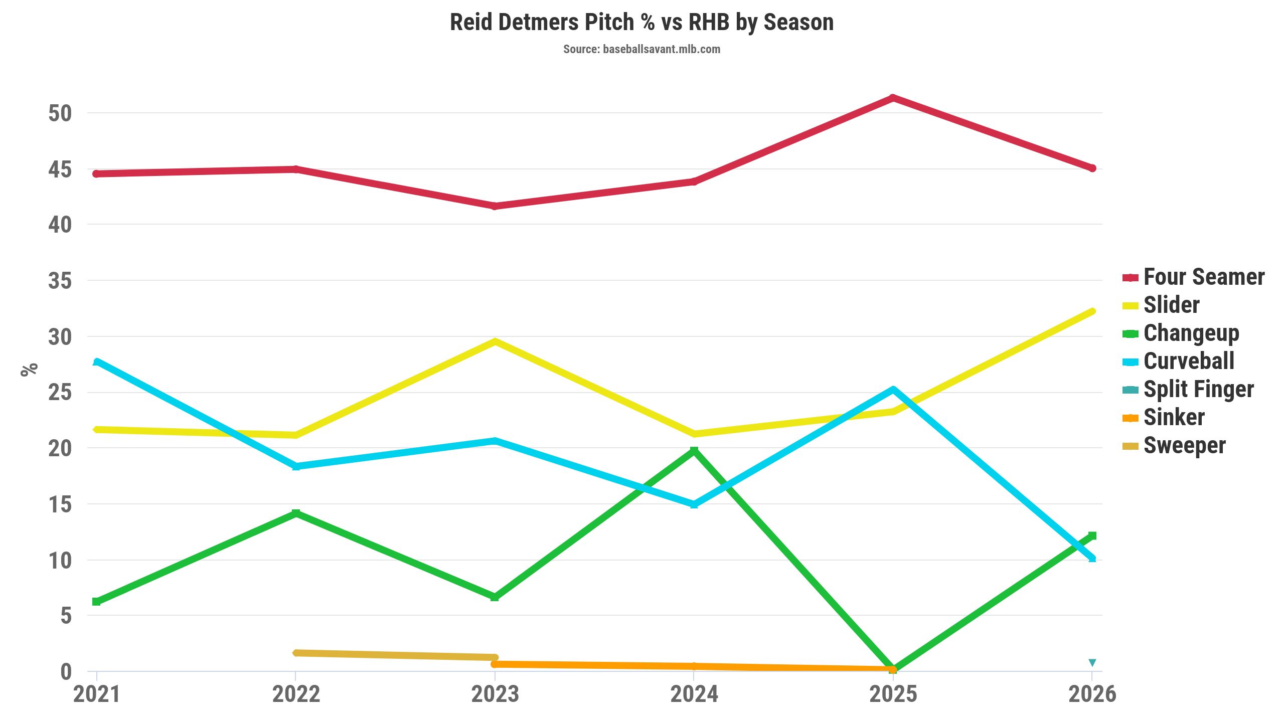 Detmers' slider has been thrown low and away from lefties (21.1% swinging-strike rate, .225 wOBA). Furthermore, the slider looks better against right-handed hitters. That's evident in the slider's 16.7% swinging-strike rate and .183 wOBA (.061 xwOBA) in 2026. Currently, Detmers has three non-fastballs with a 15-16% swinging-strike rate, including the curveball, changeup, and slider.