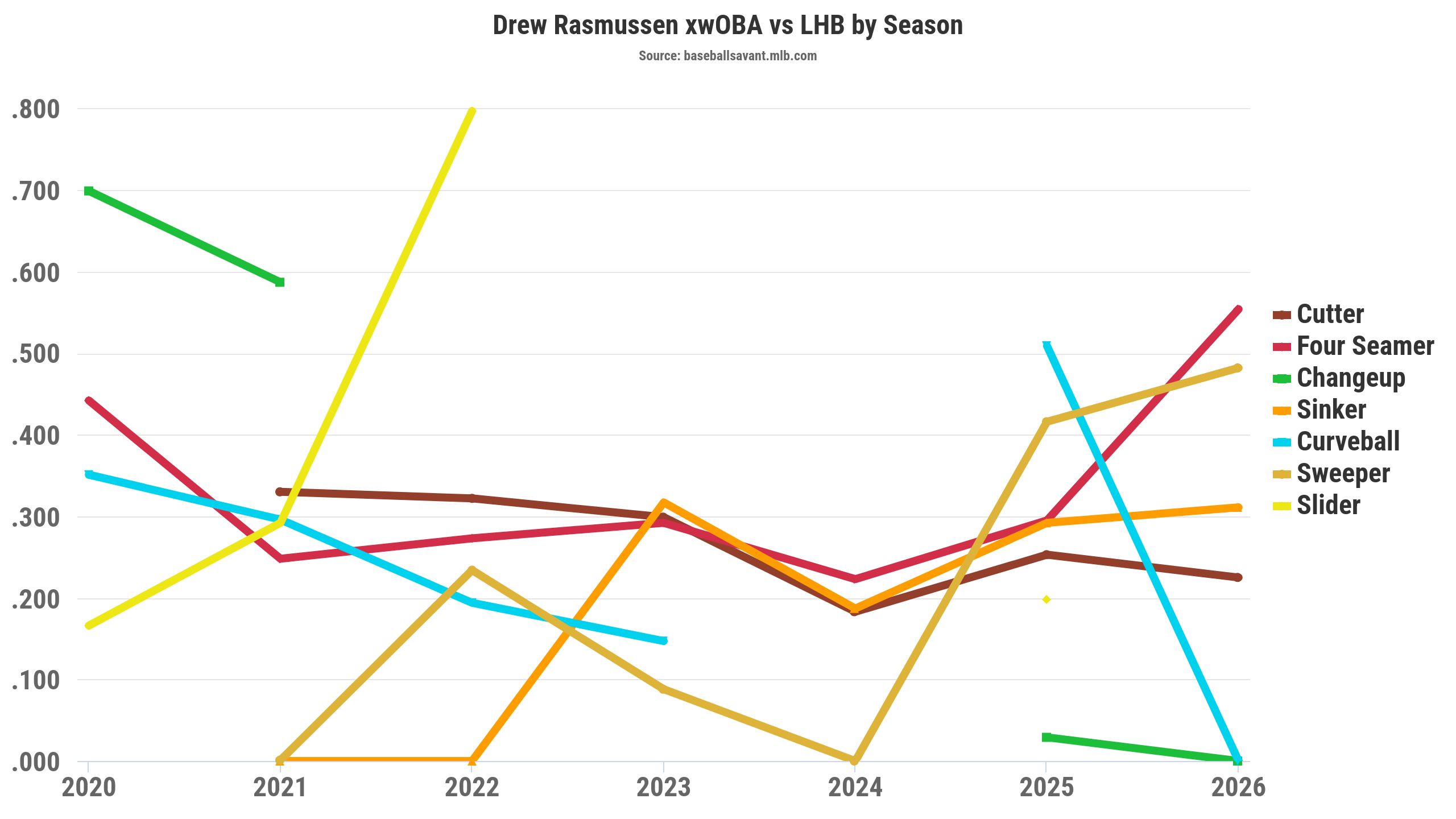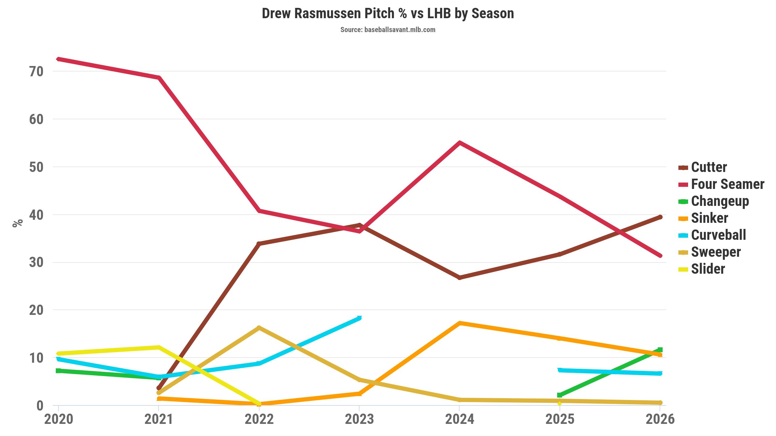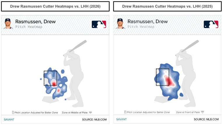 Rasmussen's most significant pitch mix change came against left-handed hitters in 2026. That's evident in Rasmussen's cutter being thrown nearly 40% of the time (39.4%) after being at 31.6% (2025) and 26.7% (2024). That coincided with Rasmussen lowering his four-seam usage (31.3%) by 12 percentage points in 2026 against lefties.